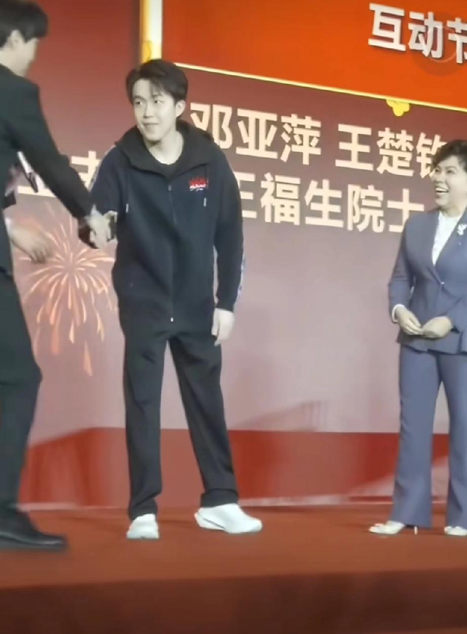 王楚钦与前辈邓亚萍一起参加首都院士专家新春联谊会当晚后台花絮。 王楚钦在后台做好妆造后就乖乖等待节目开始。 上了舞台,也是与常远友好握手。 全程都是一副超级乖巧三好学生模样! 当然了!再首都各界精英院士专家面前,奥运冠军也只能是个乖仔!