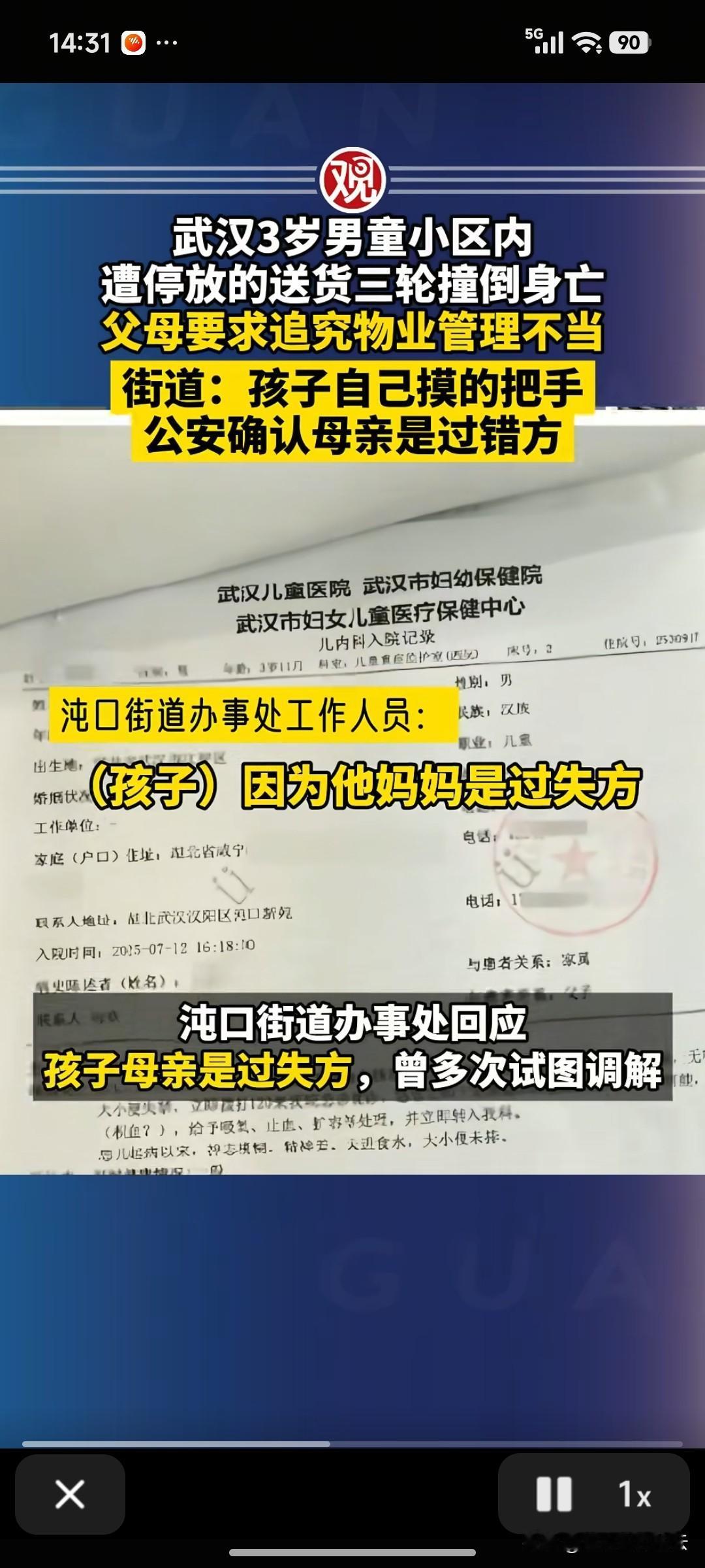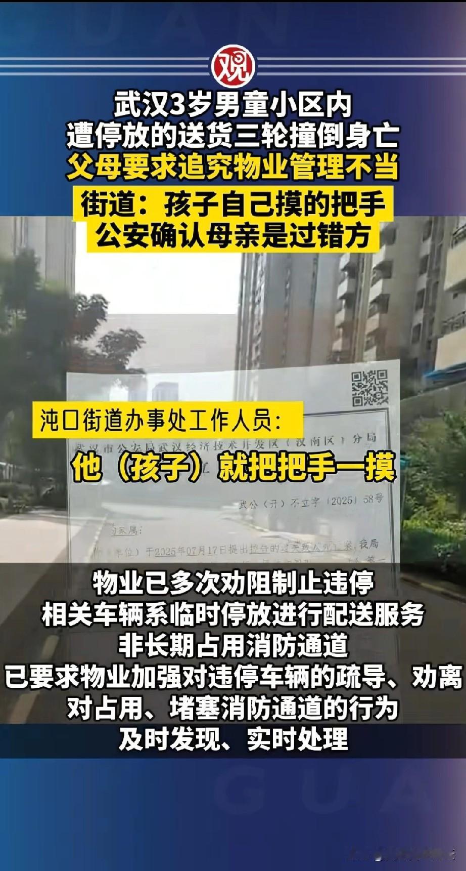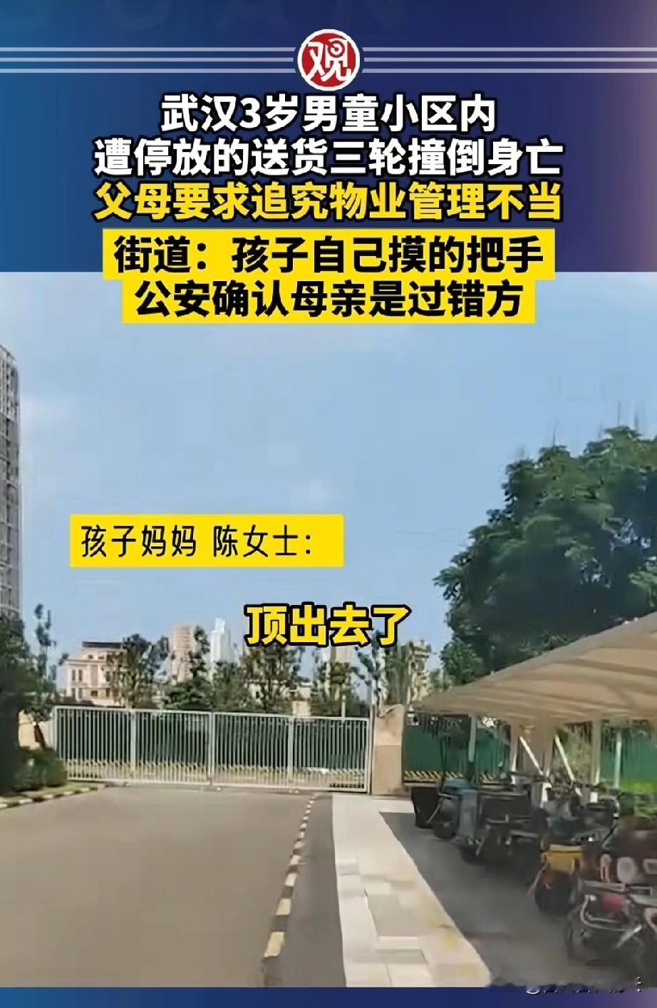 武汉,一女子3岁的儿子在小区内玩耍时,被一辆停下送货的三轮车撞死。女子和家人很心痛,她觉得这属于过失致人死亡,要求警方立案。 警方调查后发现,小孩是自己摸了三轮车的车把后,车子启动把他撞倒的。车主没有犯罪事实,不予立案。 孩子才三岁,母亲作为监护人,母亲负主要责任。 孩子妈妈和其他家属认为是三方的责任,即使他们有责任,车主和物业也应承担相应的责任。他们认为物业让三轮车进小区就是违规行为,小区内是业主活动的区域。 物业解释说,送货的三轮车是临时车辆,已经做了登记,符合要求。小区内也不属于人车分流区域。 物业和孩子妈妈各执一词,当地街道帮忙联系了司法部门对她们进行调解。街道办的工作人员说,约定好了时间,可是孩子妈妈迟迟不来,他们一群人等了她一下午。 街道办工作人员接到记者的采访时,也很无奈。他说孩子妈妈说物业有责任,要求物业一大笔赔偿,但是她又拿不出证据。 我觉得这件事家属虽然很痛心,但是三岁的孩子啊,不管怎么说,家长的责任也是最大。如果这个妈妈有异议可以向法院起诉,告诉媒体也解决不了问题。 对于这件事,你怎么看呢?