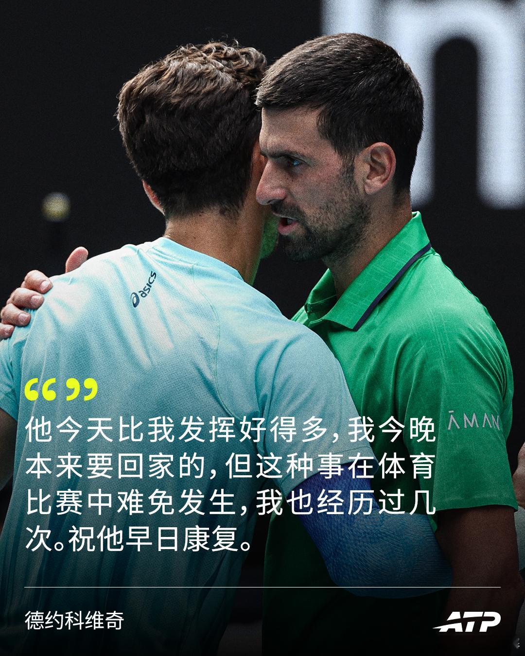 德约科维奇祝穆塞蒂早日康复“我不知道还能说什么,除了为他感到难过,祝他早日康复,毫无疑问,今天他本应该是赢家。”——德约科维奇。网来不息ATP澳网2026 德约科维奇晋级澳网男单四强