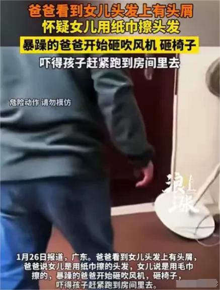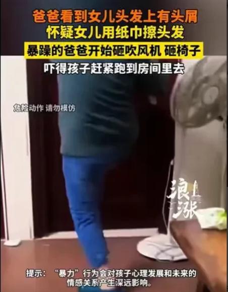 “有这样的父亲,何其不幸!”广东,女儿洗了头发,又吹干了头发,父亲却发现她的头发上有头屑,就一口咬定女儿用了纸巾擦头发,女儿反驳,说自己是用毛巾擦的,结果父亲暴怒,咂了吹风机,又砸了女儿的椅子,女儿恐惧地躲进房间,父亲更暴躁了,不停地砸女儿的房门,妻子制止丈夫,被丈夫殴打了,女儿的门被砸开之后,女儿也被父亲打了几巴掌。 “你是不是又用纸巾擦头发了!”父亲的怒吼声刚落,吹风机就被狠狠砸在地上,塑料碎片飞溅。 女孩吓得直往后退,可还是声音发抖的解释:“爸爸,我用的是毛巾,就挂在椅子后面。”这句话非但没平息父亲的怒火,反而让他更加暴躁。 男人轮番踹倒桌椅板凳,眼见无从发泄后,竟然抄起装满大米的箱子朝劝架的妻子砸去,米粒瞬间撒了一地,整个家变得混乱不堪。 女孩趁机匆忙躲进房间,反手锁上门,这套动作熟练得令人心疼,仿佛已经不是第一次“逃命”。 可那扇薄薄的木门哪挡得住一个失控的大人? 男人又开始疯狂砸门,撞击声听的人心惊肉跳。此时蜷缩在卧室墙角的女孩终于吓得哭出了声,她不明白,为何爸爸总是因为这种微不足道的小事大发雷霆? 更何况她还是被误会的,因为女孩根本没有用纸巾擦头发,男人口中的“纸巾”,只是她的头皮屑而已。 这令人窒息的过程被母亲颤抖着拍下来,视频传到网上后,所有人都感到荒唐。大家的关注点已经不在“女孩是否用纸巾擦头发了”,而是震惊于一个男人,竟然对自己的妻女如此暴力。 好在这件事引起了当地妇联和警方的注意,不仅上门介入,还安排了心理老师给女孩做疏导。法律人士也提醒:就算没造成重伤,这种反复恐吓、打砸、动手的行为,已经涉嫌违法。如果查实是长期虐待,可以撤销其监护权。 其实,这件事最扎心的地方在于,男人的行为会在孩子留下阴影。她可能会因此变得胆怯、甚至会在心里埋下暴力的种子,影响她将来人生。 回头看整件事,我们心疼那个无助的女孩,也理解那位无力保护孩子的母亲,可始终无法理解男人这样做的原因。 如果连父亲的角色都可以如此暴力,那么对于一个孩子而言,世界上还有谁是值得依靠的呢? 对此你有什么看法?欢迎在评论区留言讨论。 家庭暴力 信息来源: 浪涨新闻 文|墨海 编辑|史叔