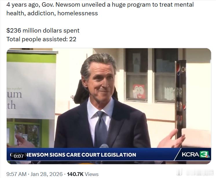 4年前,加州州长纽森公布了一项规模庞大的计划,用于应对心理健康、成瘾和无家可归问题。已花费资金:2.36亿美元实际得到帮助的人数:22人