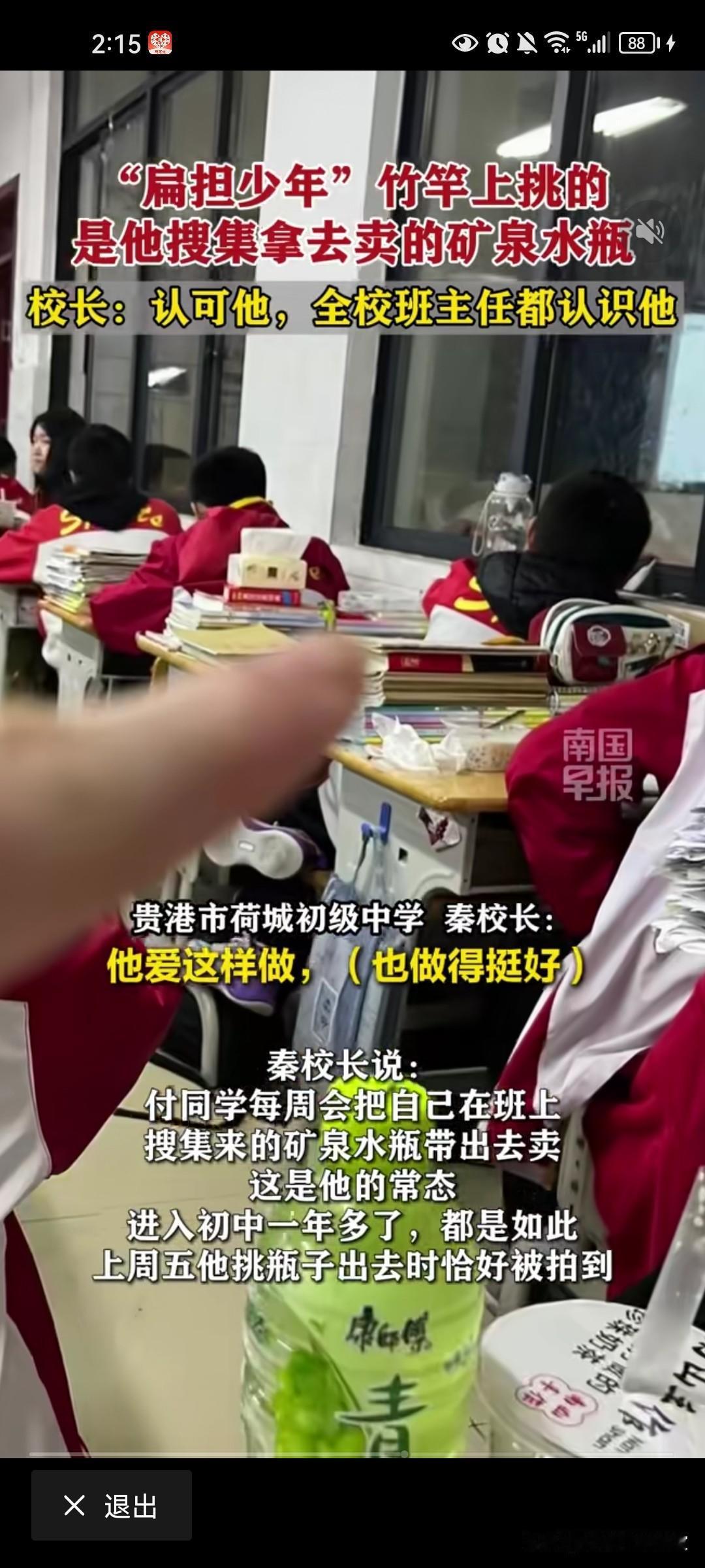 广西“扁担少年”火了!初中生挑矿泉水瓶放学,校长一句话让人破防🔥 广西贵港,一位初中生用竹竿挑着满满一担矿泉水瓶走出校园的视频,戳中了无数网友。 他不是在搞怪,而是坚持了一年多——每周把班里收集的空瓶带出去卖,用自己的方式补贴家用。 有人说他“丢人”,有人说他“懂事”,但他从不在意旁人眼光,脚步稳健,眼神坚定。 校长说:“全校班主任都认识他,他爱这样做,也做得挺好。” 小小年纪,就有如此强大的内心和担当,不偷不抢,靠自己双手赚钱,这才是最值得骄傲的少年模样! 这样的孩子,未来可期,必成大器!👍 扁担少年 广西贵港 少年强则国强 正能量