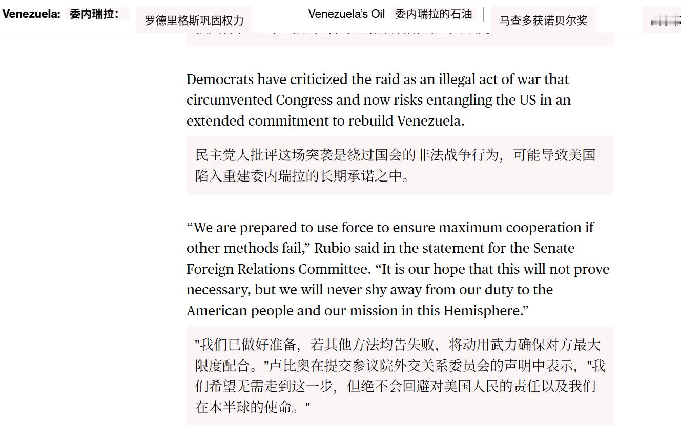 🔻彭博社:鲁比奥称,特朗普政府已准备好动用武力,以确保委内瑞拉代理总统德尔西·罗德里格斯与美国合作。🔻“我们已做好准备,若其他方法均告失败,将动用武力确保对方最大限度配合。”鲁比奥在提交参议院外交关系委员会的声明中表示,“我们希望无需走到这一步,但绝不会回避对美国人民的责任以及我们在本半球的使命。”🔻所以,其实抓走马杜罗之后,特朗普政府控制委内瑞拉石油的行动并没有像它们吹嘘的那样顺利?海外新鲜事热点现场美国前总统反对美国现政府