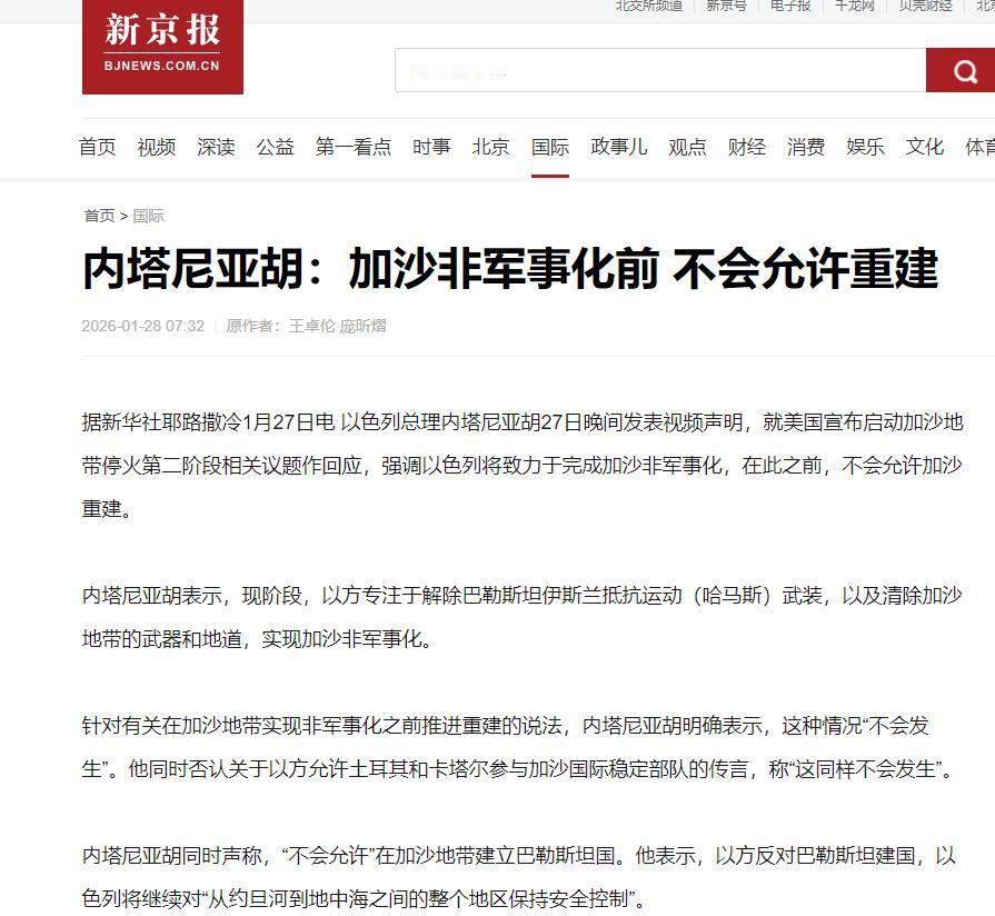 内塔亚胡现在装都懒得装了!1月27号晚上他发视频声明,针对美国提的加沙停火第二阶段安排,说得明明白白: 必须把加沙变成没武器的地方,不然想重建加沙,想都别想。这份声明里的霸道劲儿藏都不藏,全靠拳头硬来,压根不管加沙老百姓的死活,也不听国际上的劝。 他口口声声说,现在就盯着一件事:把哈马斯的武器、地道全清干净,让加沙彻底没武装。谁要是敢说先重建再加沙,他直接怼回去“不可能”,态度硬得像块石头。 更过分的是,连土耳其、卡塔尔想参与加沙稳定工作的传言,他也一口否决,同样说“不可能”,直接把外人插手的路全堵死了。 这哪是谈停火和战后安排,分明是想把加沙攥在手里随便拿捏,连装样子的耐心都没了。 可他压根不管加沙人有多惨。自从2023年10月打起来,加沙被以色列炸死的都有7万多人,受伤的超过17万,每一个数字都是一个破碎的家。 停火本是给老百姓留条活路,内塔尼亚胡却连这点机会都不给。停火后以色列就没安分过,到1月15号就违反停火1200多次,又弄死400多人、伤了1200多,还抓了50个无辜的人。 他们借着停火的名义炸民房、闯居民区,把人道主义抛到脑后。现在加沙的医院、水站全废了,吃的、药、燃料都不够,150多万人挤在帐篷里。 十几万顶帐篷还被坏天气毁了,老百姓冻得发抖、连干净水都喝不上,他还放话不解除武装就不重建,这不是明摆着折磨人吗? 以前以色列还装装样子,顾及下国际看法,现在内塔尼亚胡敢这么嚣张,就是有恃无恐。 一方面靠美国惯着,哪怕有分歧,美国也偏着以色列,特朗普还帮他说话,给他壮胆。 另一方面他要靠强硬态度拉选票,稳住自己的位置,加沙人的死活、国际的谴责,他根本不当回事。 哈马斯为了停火,找回了以色列被扣押人员的遗体,还要求以色列履约开放口岸、运进物资,可内塔尼亚胡不仅不领情,还变本加厉。 他要的不是安全,是彻底控制加沙,不让巴勒斯坦人建国。他拒绝别国参与、不让重建,就是怕被制衡,想为所欲为。 公道自在人心,靠强权压人换不来和平。内塔尼亚胡越强硬,越显得冷血自私,只会激起更多反抗。 加沙人的苦难不会被忘,这种连伪装都懒得做的霸权行径,迟早会被历史唾弃。那些在寒风里挣扎的老百姓,想要的不过是活下去的权利,这绝不该被政治野心剥夺。