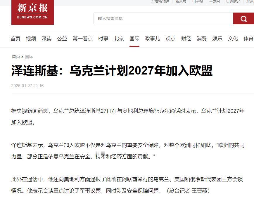 泽连斯基这脑回路咋想的呢?怎么什么话都敢说? 据央视新闻说,他27号跟奥地利总理通话,说乌克兰计划2027年加入欧盟。这话听着挺厉害,实则根本不现实。 说白了,他就是陷在战争里拔不出来,想画个“入盟大饼”稳住老百姓、绑紧西方,压根没正视眼前的烂摊子。 泽连斯基还说,乌克兰入盟不光能保障自己安全,对欧洲也有好处,还提了三方会谈的事。 可这哪是他想加就能加的?欧盟根本不可能同意,就算有些国家松口,内部也通不过,更别提得罪俄罗斯的事了。 现在乌克兰在战场上明显占下风,俄罗斯虽说打了这么多年仗实力下滑,但瘦死的骆驼比马大,炮火和资源储备远不是乌克兰能长期扛住的,泽连斯基这时候提入盟,就是故意转移注意力的政治把戏。 其实泽连斯基敢说这话,说白了就是没办法了,只能靠“画饼”续命。乌克兰经济早垮了,2026年预算一半都得靠借,六成钱都砸在了军费上,民生投入少得可怜。 老百姓日子没法过,粮食也卖不出去,黑海港口被袭后,船都不敢来,好多农场连春耕的钱都没有。 这种时候,他只能抛出入盟的诱饵,骗民众入盟就能过好日子,同时逼着西方继续给钱给物,哪怕背后的美欧繁荣计划根本实现不了,也得死死抓住。 再看欧盟那边,压根没把这话当真,还一个劲设卡。入盟有硬规矩,乌克兰一条都达不到,改革只完成了不到一半,反腐也是走过场。 更关键的是欧盟内部意见不一,奥地利说不能走捷径,那些国家谈了十几年都没入成,乌克兰两年想搞定纯属做梦。 匈牙利更是直接反对,九成五民众不认可,一旦接纳乌克兰,自己得花九十多亿美元,还得削减养老金和补贴,而且它的能源大多靠俄罗斯,根本不敢跟俄罗斯彻底翻脸。 欧盟扩员得全票同意,只要匈牙利反对,这事就黄了,之前援乌贷款都得绕开它,更别说入盟了。 欧盟怕不怕得罪俄罗斯,根本不是关键。俄罗斯是绝不容许乌克兰彻底倒向西方,一旦入盟俄军肯定会加大攻势,这点欧盟门儿清。 现在乌军也就靠偷袭打些小胜仗,根本改变不了被动局面,俄军每天狂轰滥炸,基辅经常停电,民生设施毁得厉害。 欧盟要是真接了乌克兰,就得被拖进无休止的冲突里,精明的欧洲国家才不会做这种赔本买卖。 泽连斯基自己也清楚入盟没指望,他就是说给西方听的,想把乌克兰和欧盟绑得更紧,逼着西方继续援助。说 到底,这就是一场自欺欺人的政治表演,既骗不了欧盟,也骗不了老百姓,更改变不了战场和经济的烂摊子。 泽连斯基与其纠结不可能的事,不如好好谈停火,这才是唯一的出路,再耗下去,乌克兰只会更惨,最后竹篮打水一场空。