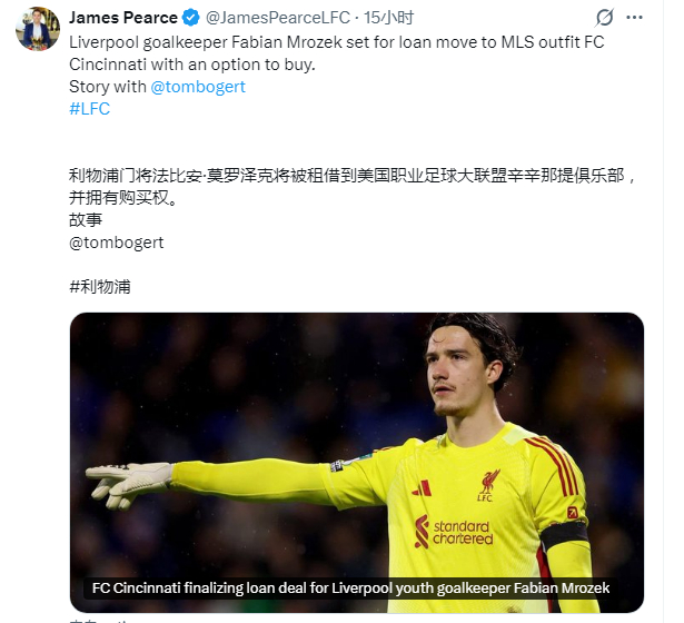 利物浦青训 皮尔斯:波兰门将姆罗泽克将被租借到辛辛那提,消息称这笔交易包含买断条款。此番加盟美职联,姆罗泽克将担任三号门将。目前辛辛那提的主力门将是美国本土门将罗曼塞伦塔诺,阵中还有 30 岁的埃文卢罗担任替补。而利物浦青训出品的保罗沃尔特斯本月已租借加盟爱尔兰的波希米亚人队,租期为一个赛季。随着姆罗泽克离队,科克比当年囤积的四名波兰门将只剩米斯丘尔