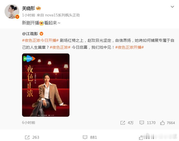 关晓彤支持江疏影新剧关晓彤打call江疏影新剧《夜色正浓》,请大家多多支持呀,