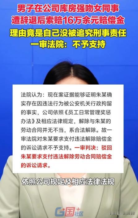 北京,部门主管朱某见女同事王某长相甜美,在王某去库房取东西时,趁其不备偷偷亲了她一口。王某报了警,朱某的行为被认定为猥亵,被行政拘留5天。出来后公司找他谈话,朱某承认事实,公司依据《员工日常管理奖惩办法》解除劳动合同。朱某不服,认为只是行政拘留,公司无权开除自己,便起诉公司,索要16万余元的赔偿,两审后法院有了最终判决。 本案来源于:2026年1月28日大河报、红星新闻、环球网等媒体的新闻报道。。 据报道,朱某在公司当部门主管,王某是他女同事。 王某长得甜,性格也好,在部门里人缘挺不错。 两人工作上有交集,朱某见着王某,心里慢慢起了不该有的念头。 2025年2月,王某去公司角落的库房取东西,这库房平时人少,朱某知道王某去了,觉得机会来了,就悄悄跟过去。 王某在库房里找东西,朱某突然凑上去,趁王某没防备,在她脸上亲了一下。 王某被这突然的举动吓得尖叫起来,她怎么也没想到,平时看着正常的同事会干这种事。 王某报了警。民警把朱某带走,最终认定朱某的行为构成猥亵,按法律规定,对他行政拘留了5天。 朱某被关进看守所,在里面熬了5天,这5天他后悔死了,可事情已经发生,没法挽回。 5天后,朱某从看守所出来,回到公司。 公司知道这事后,特别重视,马上找朱某谈话,谈话时,朱某承认自己猥亵王某。 公司有内部制定的《员工日常管理奖惩办法》,里面明确写着员工若受到公安处罚,公司有权解除劳动合同。 公司决定和朱某解除劳动关系,朱某听到这决定,觉得特别冤,他觉得自己只是被行政拘留,又不是刑事犯罪,公司不该开除他,他觉得公司太不近人情,工作没了,以后生活也受影响。 于是,朱某起诉要求公司支付违法解除劳动合同的赔偿金,一共16万多,他觉得自己权益被侵害,想靠法律维护利益。 一审法院觉得,朱某虽只是被行政拘留,但他行为严重违反公司规章制度,也违背公序良俗。 公司按内部规定解除和朱某的劳动合同,合理合法。 而且,劳动者被追究刑事责任不是用人单位解除劳动合同的唯一条件,员工受行政处罚,若违反公司规定,公司也有权解除合同。 最后,一审法院驳回朱某关于违法解除劳动合同赔偿金的请求。 朱某对一审判决不服,向上一级法院上诉。 二审法院调查认定,朱某猥亵行为事实清楚,证据确凿。 公司制定的《员工日常管理奖惩办法》经过民主程序制定,还向员工公示,有法律效力。 朱某行为符合办法里解除劳动合同的情形,公司解除合同不属于违法解除。 二审法院维持一审判决,驳回朱某上诉请求。 这事在网上引起讨论,有网友问,在公司规章制度和法律之间,到底该怎么平衡呢?员工受行政处罚,公司就一定能开除吗? 根据《劳动合同法》,劳动者严重违反用人单位规章制度,用人单位能解除劳动合同。这规章制度得满足内容合法、经过民主程序制定、向劳动者公示等条件。 该案,公司《员工日常管理奖惩办法》符合这些要求,朱某受行政处罚,属于严重违反公司规章制度,公司有权按规定解除劳动合同。 虽劳动者被追究刑事责任是用人单位解除劳动合同常见情形,但不是唯一条件。 只要员工行为严重违反公司规定,公司就有解除合同权利。 公司规章制度是否合理合法,是否明确界定“严重违反”标准,这些都得具体问题具体分析。 而且举证责任在公司,公司得提供充分证据证明员工行为违反规定。 就说这案子,朱某在库房猥亵王某,这行为本身就不对。 王某被吓得不轻,报了警,也是正常反应,按法律对朱某行政拘留了5天,也合情合理合法。 公司按内部规定开除朱某,公司是为了维护公司秩序和形象,员工在公司得遵守规定,要是有人做出这种事还不处理,公司以后还怎么管理呢? 朱某觉得冤,也能理解!他觉得行政拘留不算啥大事,公司不该这么狠开除他,可他没想过,他行为对王某造成多大伤害,对公司也有不良影响。 职场里的人,得遵守道德和法律规范,别以为只是小事,就随意越界,一旦做了不该做的事,就得承担后果。 公司也得注意,制定规章制度得合理合法,不能随便定个规定就开除员工,得有明确标准和依据,处理员工时,也得按程序来,提供充分证据。 要是公司规章制度不合理,员工不服气,也容易引发纠纷,就像有些公司规定太苛刻,员工稍微犯点错就被开除,这也不合适。 员工也得了解公司规章制度,知道哪些事能做,哪些事不能做。别等到被处理了,才觉得冤。平 大家对这案子有什么看法呢,欢迎留言讨论。说说你们对职场权益和公司管理规定的想法,或者讲讲自己遇到类似的事,一起交流交流。