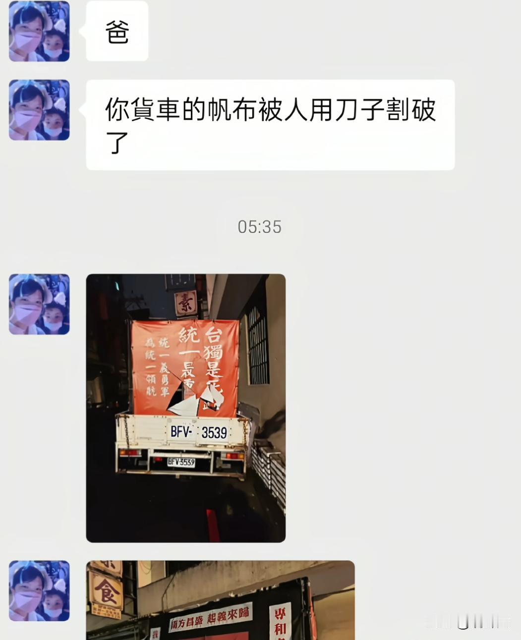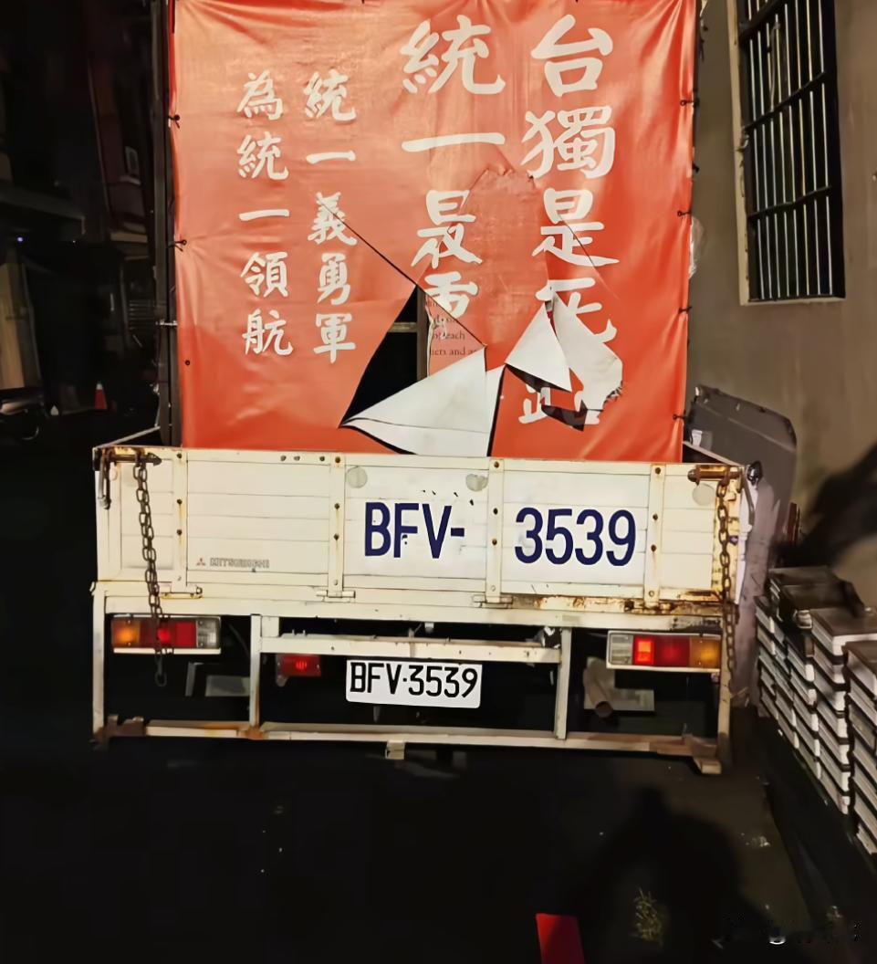 中国台湾统一义勇军宣传车今日凌晨遭到破坏,车子侧面的五星红旗被人用刀子划破,疑似是“独派”所为。 1月28号凌晨五点多,人在大陆的统一义勇军总司令卢朝财收到女儿发来的信息,原来是卢朝财在台湾的货车被人破坏,车子后面的帆布宣传语与侧面的五星红旗都被人用刀子划破,卢朝财得知消息后非常生气,因为这辆小货车是统一义勇军的宣传车,平时去抗议民进党“独派”时装东西用的,去年就被人用车辆恶意撞坏过一次,也是凌晨撞的,而且去年那次卢朝财人也在大陆,这也太奇怪了,为什么总有人趁卢朝财不在家去破坏这辆车子?根据卢朝财推断,是岛内“独派”所为,去年已经报警了,警方没有查出来是谁干的,今天再次遭到破坏,卢朝财就拜托了义勇军副总司令从宜兰赶过来报警处理,目前的情况是当地警方已经在处理调查当中,不知道会不会查出结果。 我认为应该装个监控,总是被人破坏也不是办法,万一哪天有人在刹车发动机方向盘这些部位搞破坏怎么办?所以应该在宣传车边上装个监控摄像头。 另外我认为搞破坏的人应该很熟悉卢朝财的行踪,要不然怎么两次都是趁卢朝财不在家去搞破坏的呢?而且时间都是凌晨,这个坏人可能离卢朝财家不远。