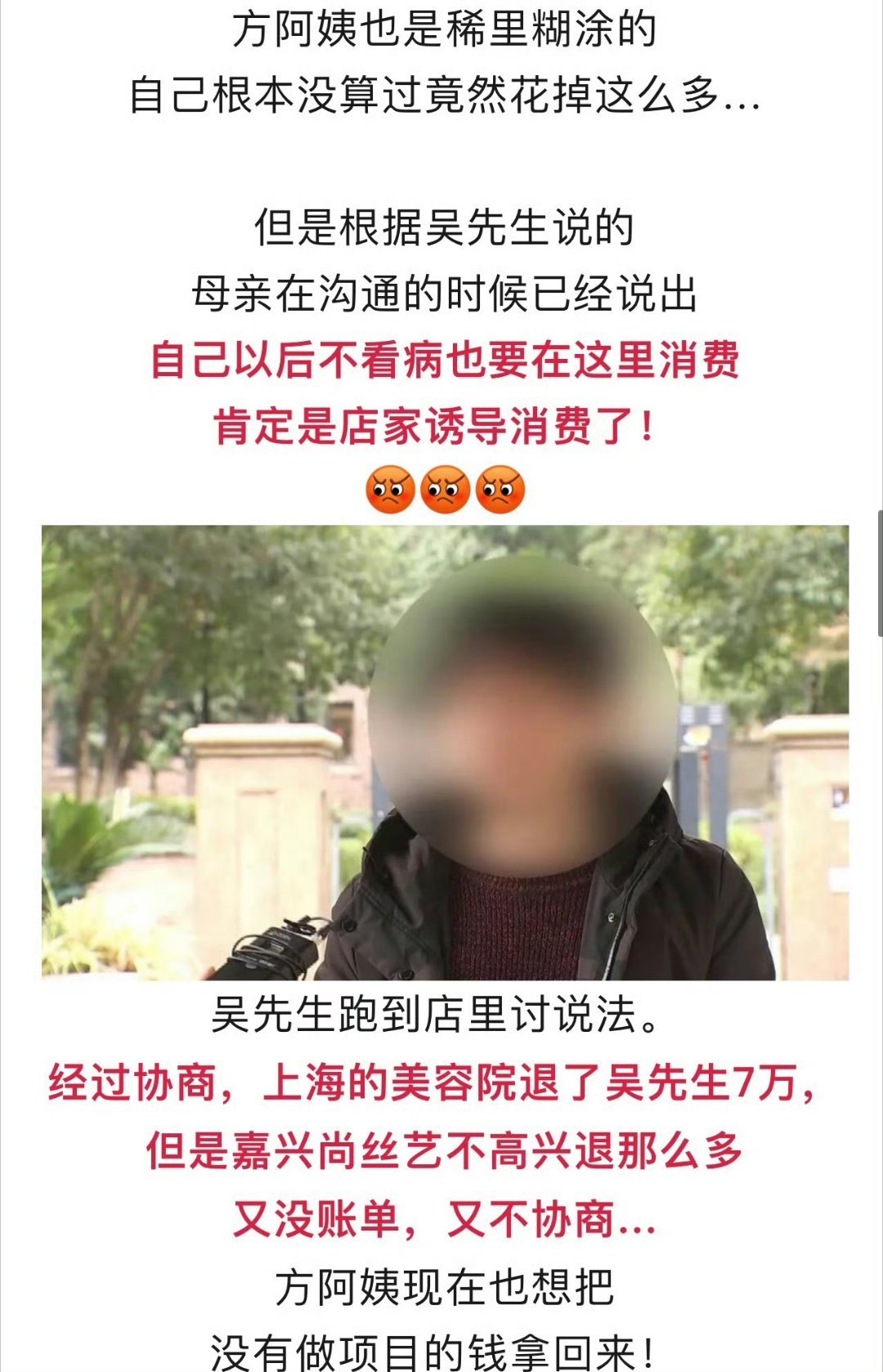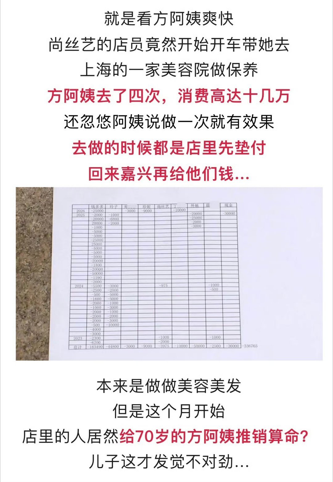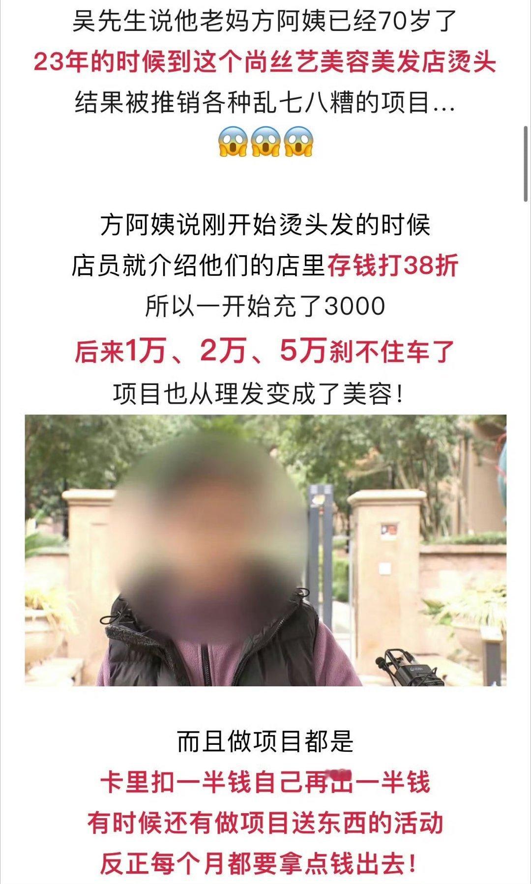 浙江70岁阿姨在美容院充30多万 嘉兴这种店都冒出来了?70岁老阿姨掏出30多万!美发变成算命推销?儿子查完帐闹上电视!带记者上门讨说法,门店态度强硬:最多只退2万6!19楼网友吴先生爆料:我70岁老母亲在双溪路罗马都市店面尚丝艺美容美发,从2023年8月至今被诱导消费33万余元!商家连消费明细和发票都拿不出,也不肯退钱,真的好无力好惨啊!来源:嘉兴19楼