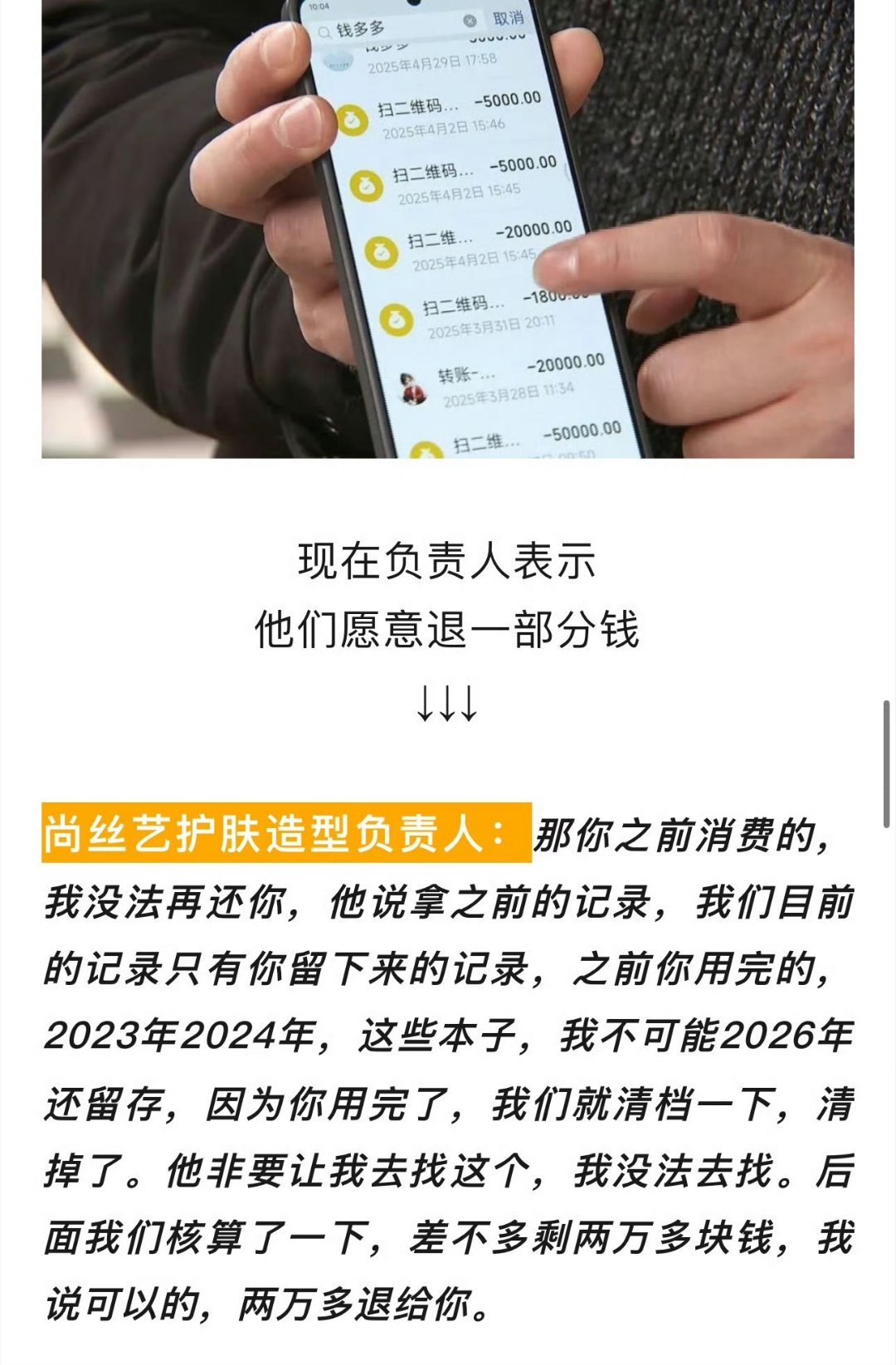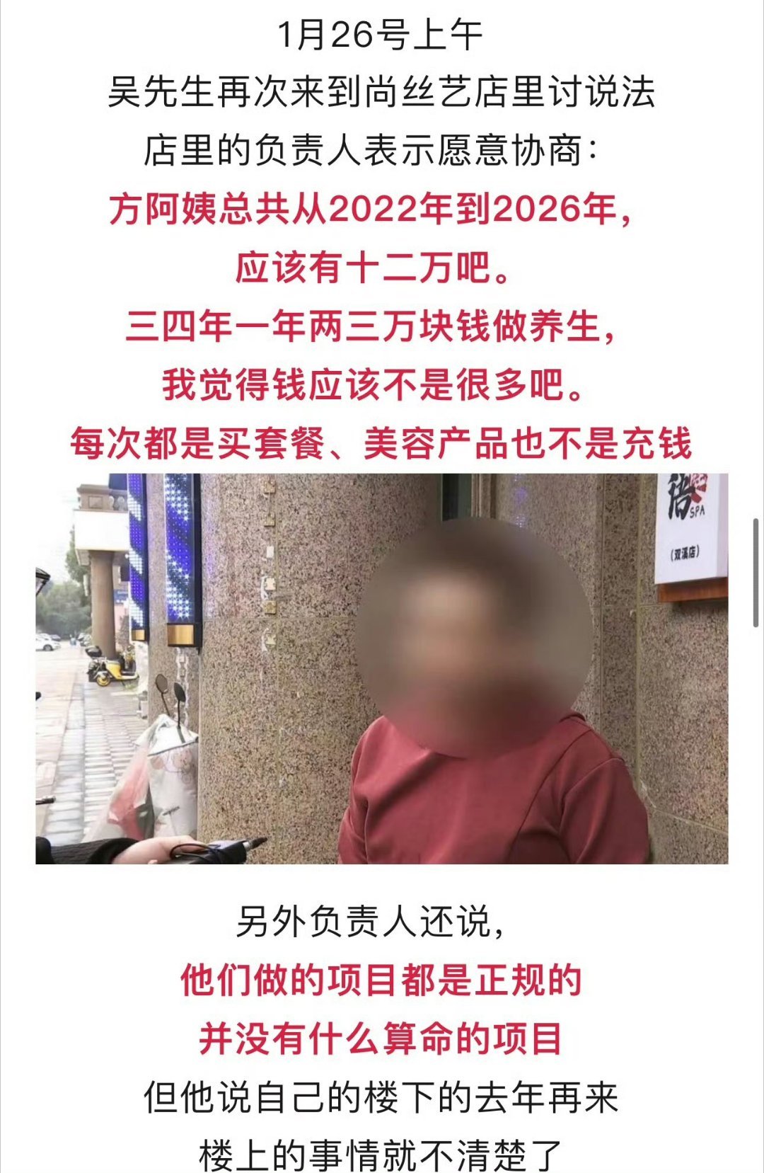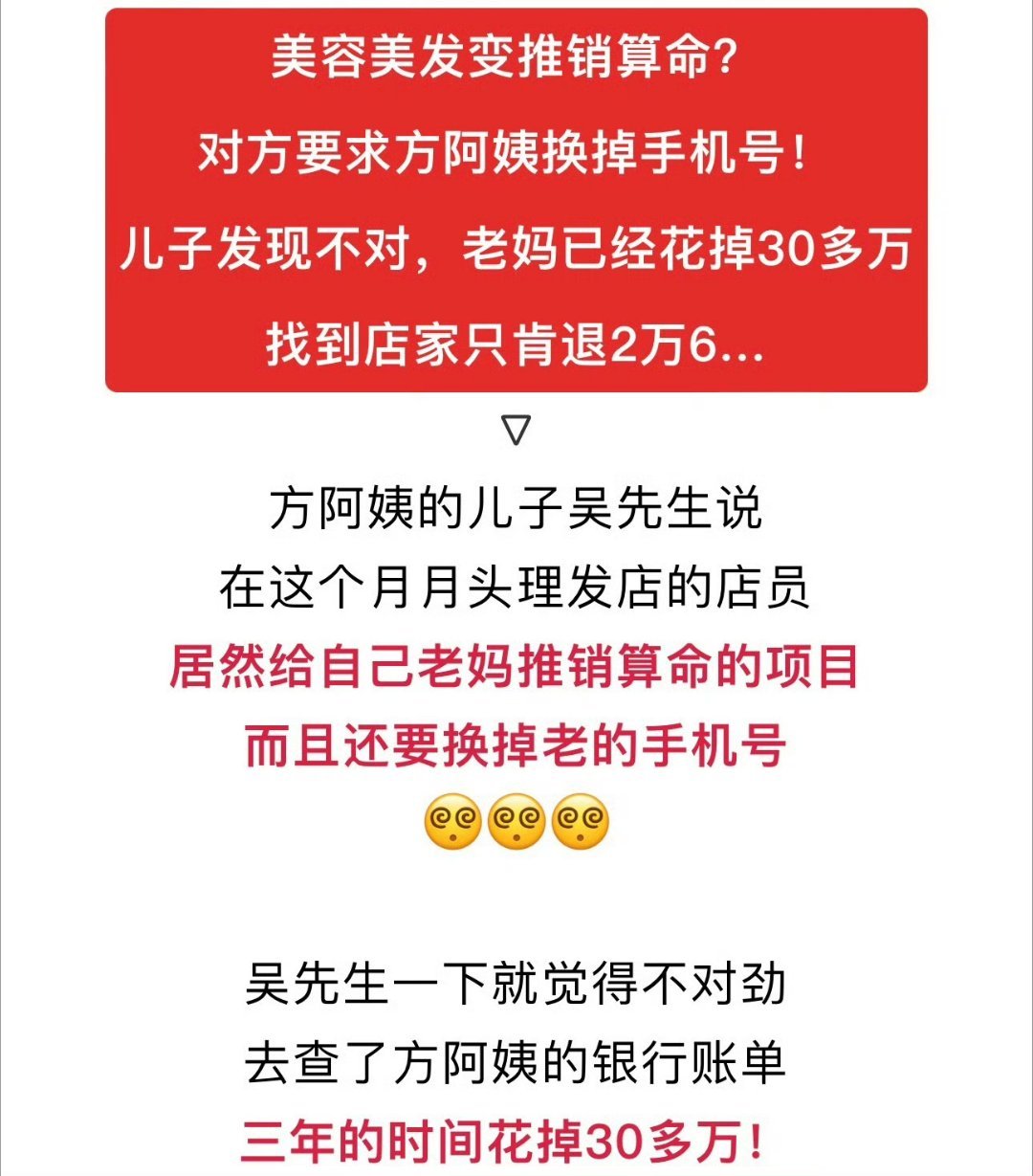浙江70岁阿姨在美容院充30多万 嘉兴这种店都冒出来了?70岁老阿姨掏出30多万!美发变成算命推销?儿子查完帐闹上电视!带记者上门讨说法,门店态度强硬:最多只退2万6!19楼网友吴先生爆料:我70岁老母亲在双溪路罗马都市店面尚丝艺美容美发,从2023年8月至今被诱导消费33万余元!商家连消费明细和发票都拿不出,也不肯退钱,真的好无力好惨啊!来源:嘉兴19楼