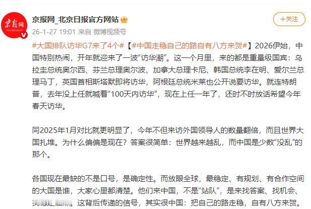 兜兜转转最后发现,还是中国好!大国排队访华,G7来了4个! 说实话,这两年看世界风云变幻,越品越明白一个理:不管是大国还是小国,绕来绕去,终究得承认,还是中国靠谱! 2026年刚开年一个月,咱们国门就迎来了一串大人物:乌拉圭总统奥尔西、芬兰总理奥尔波、加拿大总理卡尼、韩国总统李在明、爱尔兰总理马丁,挨个登门。 英国首相斯塔默1月28日正在访华,阿根廷总统米莱也明确说要过来。这不仅是礼节性外交,更是实打实排队找合作,谁都不想错过和中国打交道的机会。 加上去年年底,法国总统马克龙、西班牙国王菲利佩六世、德国外长瓦德富尔也先后来过,算下来G7集团里,已有四个国家的核心领导人访华,这可不是单纯的外交热闹。 就说加拿大总理卡尼,这次来访收获满满。之前中加贸易有点别扭,加拿大油菜籽、牛肉进中国门槛不低。 这次谈妥后,咱们把油菜籽关税从84%降到15%,直接给加拿大农民打开大门,单这一项就带来约30亿加元订单,合一百多亿人民币。 加拿大也懂事儿,把中国电动车关税从100%降到6.1%,还给了4.9万辆进口配额,这就是互相成就,双方还敲定8个合作项目,重启了暂停的能源、警务合作。 去年马克龙访华的时候,还带了80多人的代表团,光企业高管就有35位,空客、法国电力等巨头全来了。 三天时间就签了超800亿欧元合作协议,创中法建交以来单次访问纪录。咱们一下订了100架空客飞机,还敲定在天津建第二条A320neo总装线。 投产后中国将承担空客全球五分之一产能,本地化率直接提高了不少,还能参与A350机身研发,这是从中国制造往中国创造迈进的信号。 有人可能觉得,这些都是欧洲国家,本来就有合作。那再看其他地区,阿根廷总统米莱急着访华,因为中国是他们的定心丸。 阿根廷经济困难、外汇紧张,是咱们续签350亿元人民币货币互换协议,让他们能用人民币买进口货,不用死磕美元。 美国财长想挑拨离间,人家根本不理,转头就和咱们续约。乌拉圭也和咱们深度合作,农业、能源、数字经济都有涉足,直言跟着中国干有奔头。 G7本是西方抱团的小圈子,以前总想着给咱们使绊子,现在法、德、加、英主动示好,说白了就是经济复苏离不了中国这个稳定器。 英国带300多人代表团访华,重启停摆8年的合作机制;德国也想稳住对华贸易,毕竟他们的汽车、机械离不开中国市场。 为啥全世界都来找中国?道理很简单:一是咱们有14亿人的稳定大市场,啥好东西都能卖得动。 二是产业链完整、经济大盘稳,这些年GDP稳步增长,这种稳定性全球少见;三是咱们讲诚信、守规矩,合作只讲互利共赢,不搞霸权那套。 如今各国排队访华,靠的是中国越来越强的国力。以前是咱们求着合作,现在是别人主动上门,这就是实力的体现。 那些“脱钩断链”的说法,在实实在在的订单和协议面前全是空话。说到底,中国好就好在经济稳、市场大,讲合作、守诚信,互利共赢不欺负人。这就是中国的魅力,也是咱们中国人的骄傲!