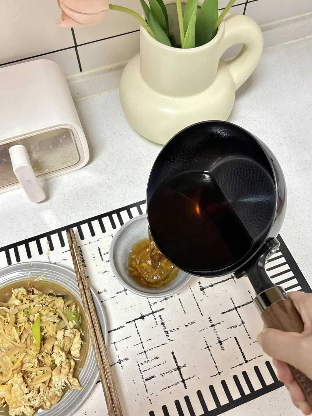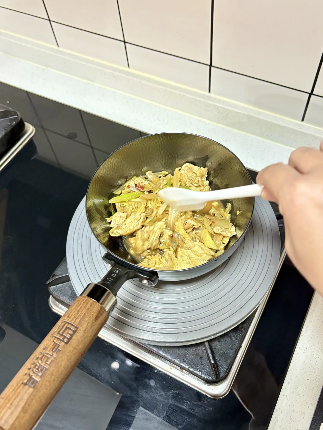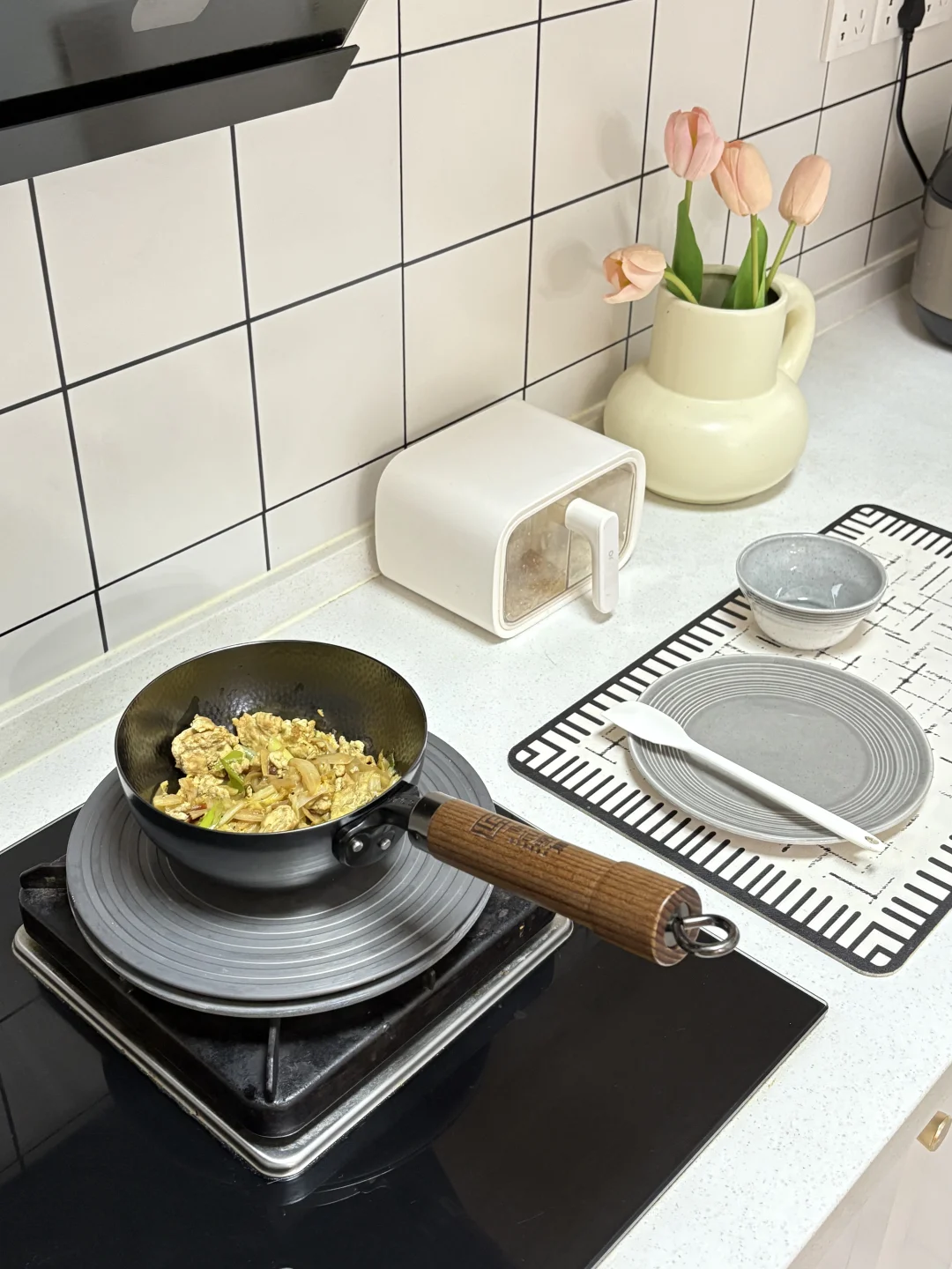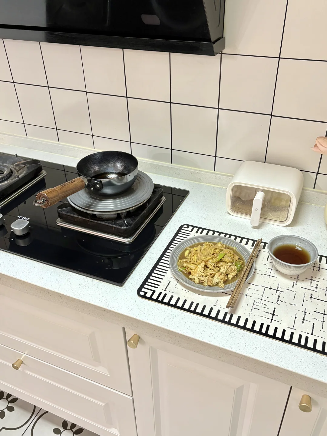 我家厨房本身进门处很小 我是把两边墙垛敲掉 平分三份 一扇薄柜➕两扇联动推拉门 推拉门刚好隐藏在薄柜后面 薄柜后面刚好挡住冰箱 这样设计太棒啦! 厨房的烟火气 就是这口小奶锅给的 平时自己吃饭 炒一个菜刚刚好 再煮个红糖水 简简单单的一餐 不粘锅的材质新手也可以轻松上手 再搭配喜欢的餐具 吃饭氛围感满满~