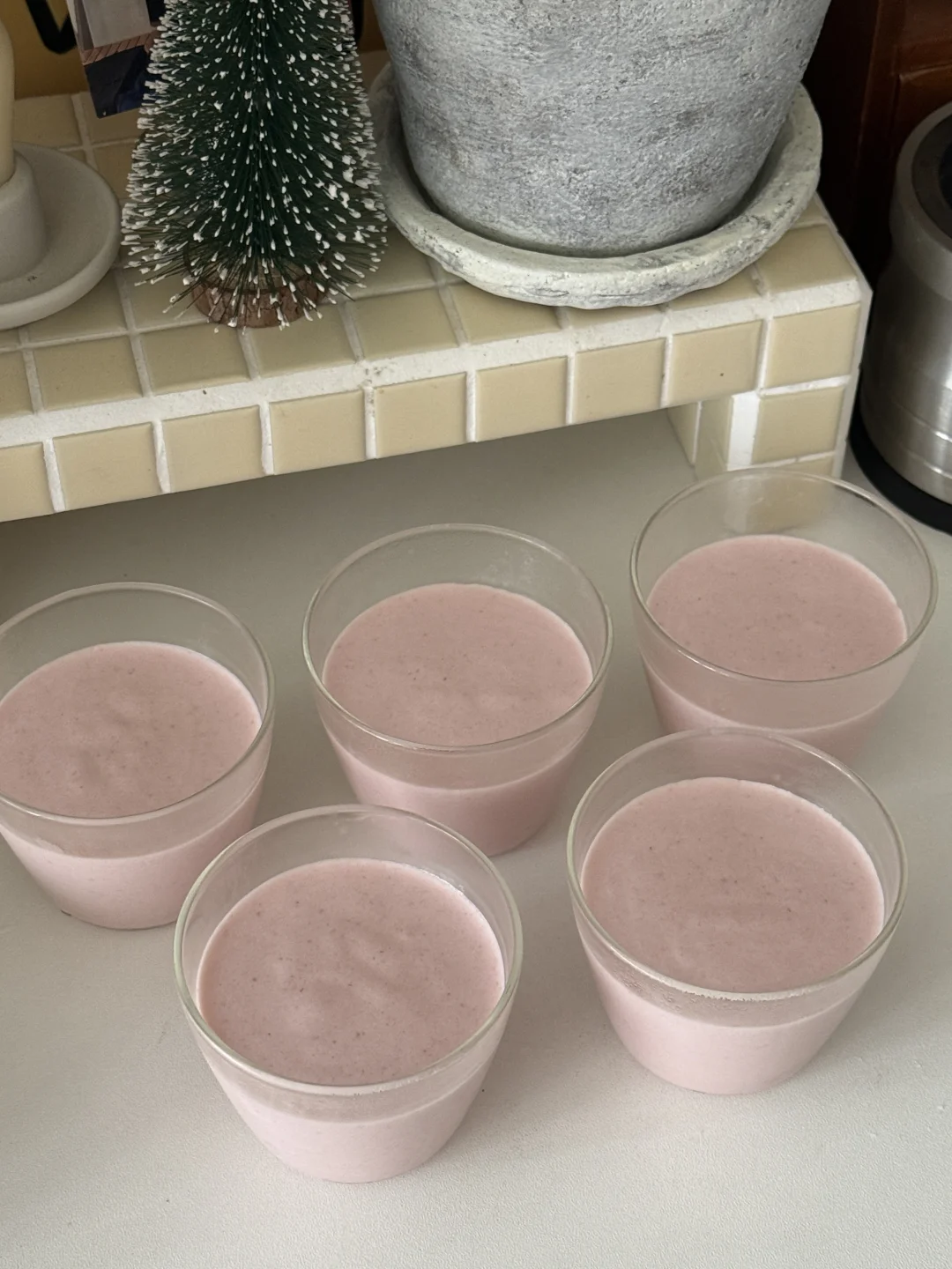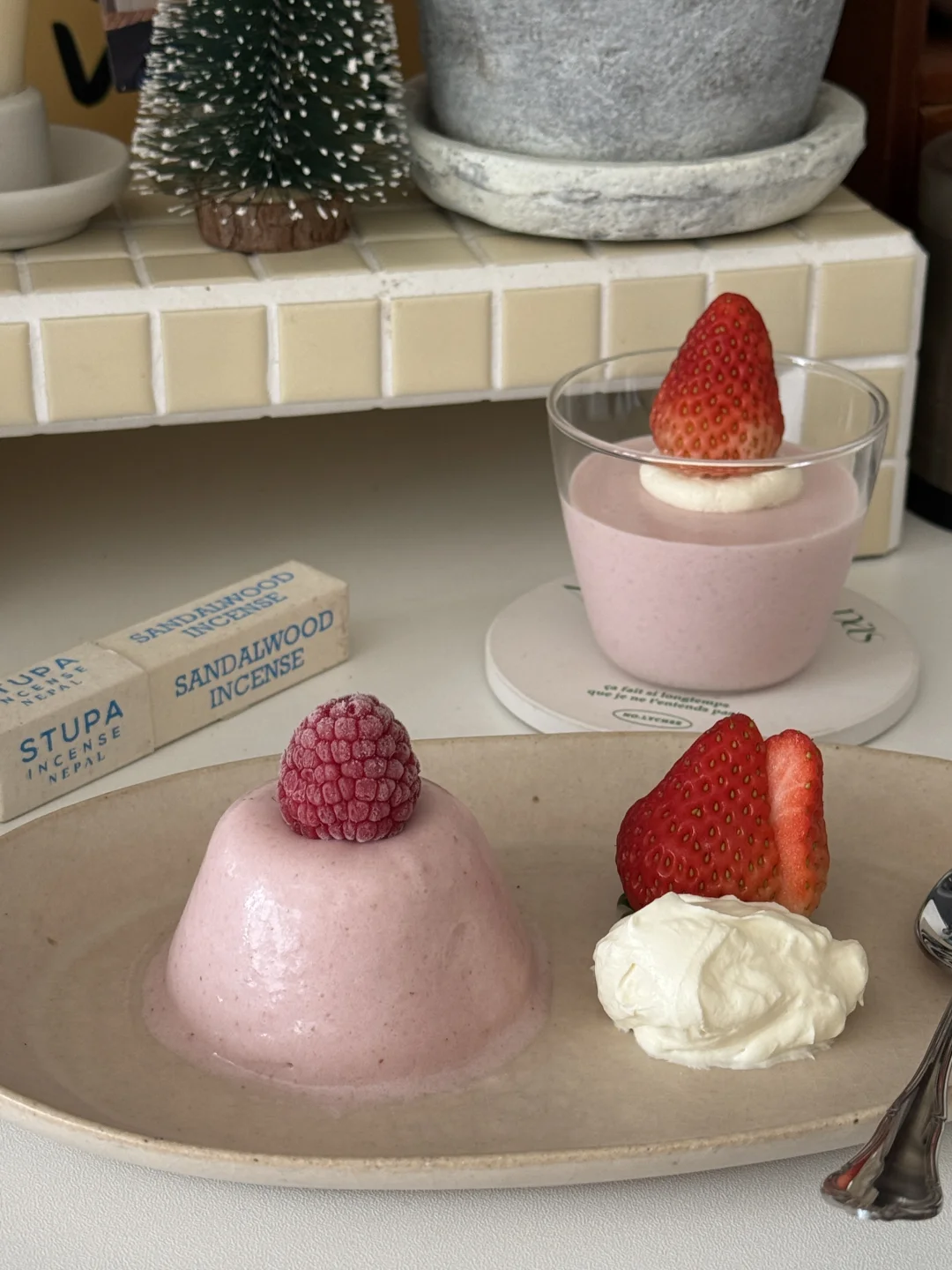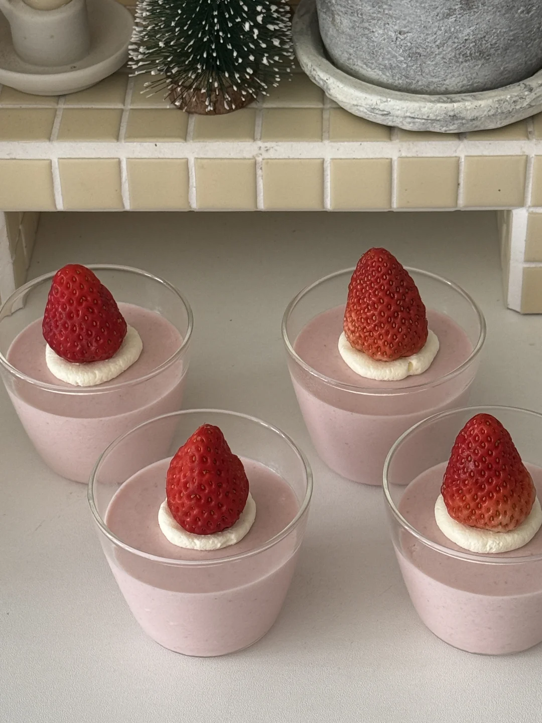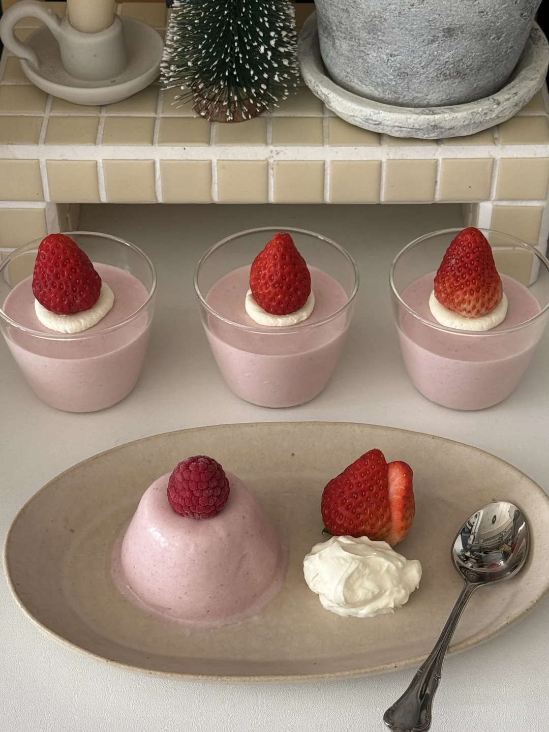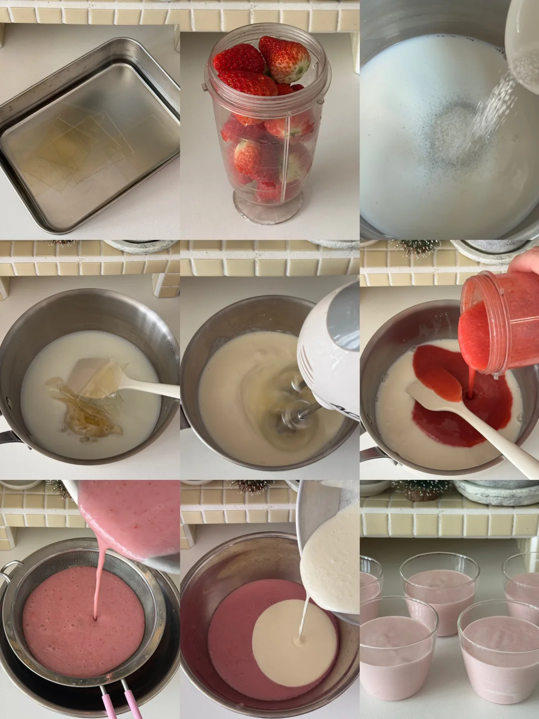 草莓季就是变着花样吃草莓 做了简单快手的草莓慕斯🍓 - 草莓慕斯📒 - ▪️草莓300g|牛奶:100g|糖:20g| ▪️淡奶油100g|吉利丁片:10g| - ▪️吉利丁片放入冷水泡软备用 ▪️草莓洗净后用料理机打成果泥备用 ▪️牛奶加入糖小火把糖煮化即可 ▪️吉利丁片攥干水加入牛奶搅匀 ▪️牛奶里倒入草莓果泥搅匀 ▪️淡奶油打发至酸奶状 ▪️将两者混合均匀倒入模具冷藏 - 不甜 真的不甜 给小朋友吃甚至说酸[偷笑R] - 入口一抿就化 比布丁的口感要更绵密[赞R]