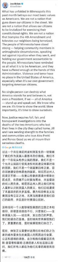 久未露面的美国前总统拜登昨晚(北京时间 1 月 27 日晚)发文批评特朗普政府:“过去一个月在明尼阿波利斯发生的一切背叛了我们作为美国人最基本的价值观。” 明尼阿波利斯这一个月的事,说起来离谱又心寒。联邦移民执法局的人在当地执法,短短一个月里接连开枪打死两名美国公民,先是古德,后是普雷蒂,两个活生生的人就这么没了。 特朗普政府那边嘴硬得很,一口咬定执法人员是自卫,还把两个死者扣上 “本土恐怖分子”“职业煽动者” 的帽子,说得好像杀了人还理直气壮。 可现场的视频早就传得满世界都是,普雷蒂手里拿的明明是手机在拍摄,压根没有枪,却被执法人员乱枪打死,身中数弹的画面,任谁看了都觉得触目惊心。这种明摆着的滥用暴力,特朗普政府还死撑着不认错,这就成了拜登手里最好用的把柄。 拜登选在这个时候发声,时机卡得不能再准了。此前奥巴马、克林顿都已经跳出来谴责特朗普政府,民主党这边从州长到议员,早就和特朗普政府掐得不可开交,明尼苏达州州长直接把联邦执法人员比作纳粹的盖世太保,国会里的民主党人更是放话要停掉国土安全部的拨款,眼看反对的声势越来越大,拜登这个前总统再不露面,怕是就要在民主党里彻底没了存在感。 他这篇发文,看似是单独表态,实则是跟民主党阵营的节奏踩在了一起,借着民众对执法暴力的愤怒,站在道德制高点上,狠狠踩特朗普一脚。 更重要的是,拜登心里打的从来都是选举的小九九。虽说现在还没明确说要参选 2028 年大选,但民主党眼下也没个特别能扛旗的人物,他这个前总统只要还能在公众视野里保持热度,就还有机会。 之前拜登的支持率一直不咋地,年龄问题也被诟病,这次借着明尼阿波利斯的事发声,刚好能拉拢那些对特朗普移民政策不满、对执法暴力愤慨的选民,尤其是底层民众和少数族裔,这些可都是民主党的基本盘。骂一骂特朗普的 “反价值观”,就能轻松赚一波好感,这种稳赚不赔的政治表演,拜登怎么可能错过。 而特朗普政府这边的反应,也还是老一套的死不认账加甩锅。特朗普自己发推把锅全甩给民主党,说明尼阿波利斯是民主党主政的地方,是他们不配合联邦执法才导致的混乱,把自己摘得干干净净。 国土安全部更是硬着头皮维护执法人员,哪怕视频证据摆在眼前,也不肯改口。甚至还反过来给明尼苏达州州长提条件,要人家废除移民庇护政策、共享社保数据,才肯谈执法人员的去留问题,活脱脱一副 “我错了但我就不改,还要逼你妥协” 的嘴脸。 拜登的批评和特朗普的甩锅,看着是针锋相对,本质上其实是一丘之貉。两个人都盯着政治利益,没人真正在乎明尼阿波利斯那两条逝去的人命,也没人在乎上街抗议的民众想要的公道。 普雷蒂是个救死扶伤的护士,性格温和连犯罪前科都没有,就因为想保护路人,被执法人员乱枪打死;古德不过是想驾车离开,就身中数弹殒命。可他们的死亡,到头来却成了美国两党互撕的筹码,成了拜登刷存在感、特朗普巩固基本盘的工具。 拜登嘴里喊着的 “基本价值观”,在美国早就成了一句空口号,美国口口声声说保障公民权利,可明尼阿波利斯的民众连基本的生命安全都守不住,执法人员可以随意开枪,事后还能被政府包庇,地方政府想介入调查,连现场都进不去,联邦方面直接把人拒之门外。 所谓的法治和公正,在权力和政治面前,脆弱得不堪一击。而拜登就是借着这句空口号,把自己塑造成守护价值观的英雄,可他当总统的时候,美国的执法暴力、种族矛盾也没见得解决多少。