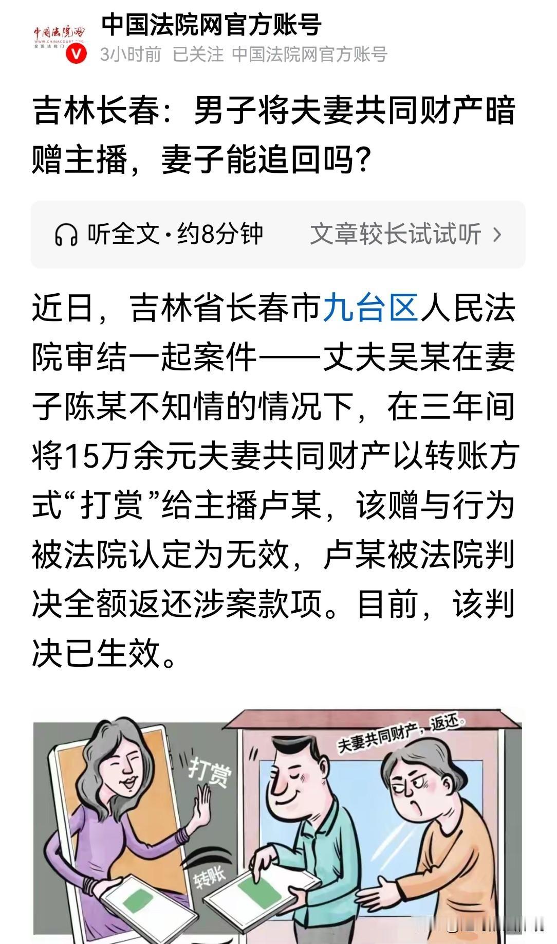人财两空!吉林省长春,女子发现丈夫经常给一女主播转账,具有特殊含义的520、1314,共计15万元,还给女主播买手镯、手首饰、机等财物,时间长达3年。妻子要求丈夫把钱物要回来,多次都商量不通,妻子愤怒将女主播告上法庭,要求其全额返还所赠15万,法院判了! 陈某偶然发现丈夫吴某的微信账单不正常。 账单显示,在长达3年的时间,丈夫持续向一个陌生人卢某转账。 累计金额超过了15万元,转账记录中,多次出现520、521、1314等特殊情感含义的数字。 妻子的天都塌了!她气的浑身发抖:“我跟你结婚多年,你给了我什么?” 还把我挣的钱转给别的女人? 陈某瞅准机会查看了丈夫的聊天记录,发现卢某曾多次向吴某索要手镯、首饰、手机,丈夫吴某都答应了。 原来,吴某在3年前在平台,关注了一位漂亮女主播卢某。 开始他在卢某的直播间频繁给她打赏,两人熟悉后,互加了联系方式。 吴某不再打赏,而是直接向卢某的私人账户转账。 陈某认为,这些钱是夫妻俩共同打拼积攒的存款,属于共同财产。 丈夫在未与她商量的情况下,将大额财产赠与其他女人,违背了夫妻间的忠实义务。 开始陈某多次和丈夫沟通,家里存点钱不容易,以后需要用钱的地方很多。 她让丈夫去把钱要回来,多次商量,都被丈夫一口拒绝。 陈某气炸,既然你无情,也别怪我无义。 她将主播卢某起诉至法院,要求其全额返还15万。 随后,陈某向法庭提交了转账记录,和聊天截图等证据。 证明吴某与卢某之间的资金往来,以及索要财物的情况。 吴某本人也当庭承认,这些转账,确实未经妻子同意,并且他与卢某之间的关系,超出了普通的网络互动。 法院认为,案子的争议点在于,吴某向卢某转账的行为本质究竟是什么。 是卢某主张的,基于其提供直播服务,而产生的消费合同关系。 还是陈某所认为的,属于未经配偶同意的无效赠与。 陈某称,15万元远远超出了家庭日常生活的正常开销,不属于夫妻一方可以单独决定的家事代理权范畴。 而卢某,在明知吴某有配偶的情况下,仍然持续索要并接受大额财物,主观存在恶意。 吴某在婚姻期间,擅自将大额夫妻共同财产,赠与婚姻关系之外的第三人。 其既侵犯了她对共同财产的平等处理权,也违背了公序良俗,应当被认定为无效赠与。 卢某不服,她则坚称,自己作为一名网络主播,通过直播,向观众提供了娱乐服务。 吴某的转账是自愿打赏,属于正常的网络消费行为,双方形成的是服务合同关系。 这也是行业内常见的互动模式,自己已经提供了相应服务,不应当承担返还钱款的责任。 法官发现,吴某向卢某的转账中,不仅有大额款项,更包含了大量带有示爱含义的特殊数字金额。 这与通常意义上,观众在直播平台上对主播表演给予的赞赏行为,存在明显区别。 这些特征,吴某的转账,更符合赠与的法律特征,而非卢某所声称的单纯服务对价。 法院会怎么判? 法院经过审理后认为,夫妻双方,对共同财产享有平等的处理权,但这种权利并非没有限制。 对于明显超出家庭日常生活需要的大额财产处分,必须经过夫妻双方的共同协商和一致同意。 吴某长期、大额地向网络主播进行转账,显然不属于家事代理的范畴。 而且,吴某与卢某在3年间,持续进行资金往来,且大量转账金额,含有特殊情感寓意。 超出了正常的社交或消费范畴。 聊天记录中,卢某主动向吴某索要财物,足以认定,双方之间实际上构成了赠与关系。 卢某在知晓吴某婚姻状况的前提下,仍然持续索要并接受大额转账。 其取得这些财产的行为,不能被认定为善意。 因此,吴某的赠与行为,既违反了夫妻共同财产处分的基本原则,也违背了公序良俗。 民法典有相关规定,违背公序良俗的民事法律行为是无效的。 无效的行为,自开始时就不具备法律约束力。 法院依据双方提交的详细转账记录,进行了精确核算。 根据法律规定,夫妻在婚姻关系存续期间所得的下列财产,为夫妻的共同财产,归夫妻共同所有:工资、奖金、劳务报酬;生产、经营、投资的收益等。 吴某在婚姻期间,向女主播转账的15万元及购买的财物,均来源于夫妻共同财产。 吴某未经妻子同意,将大额财产:赠与婚外第三人,违反了夫妻共同财产平等处理权。 女主播明知吴某有配偶,仍接受赠与,其行为违反公序良俗,所以该赠与行为无效。 法律赋予夫妻对共同财产的平等话语权,防止一方擅自处置家庭重大资产。 婚外赠与,因违背婚姻忠诚原则,而不受法律保护。 因女主播的获利无合法依据,女主播需返还财产,符合任何人不得因违法行为获利的基本法理。 夫妻要相互忠诚,婚外赠与不仅可能被追回,还可能因违反道德,承担法律后果。 最终,法院判决,卢某向陈某返还夫妻共同财产14万余元,及相应的利息。 对此,你怎么看? 关注@赵哥的法律观,明辨是非不上当。
