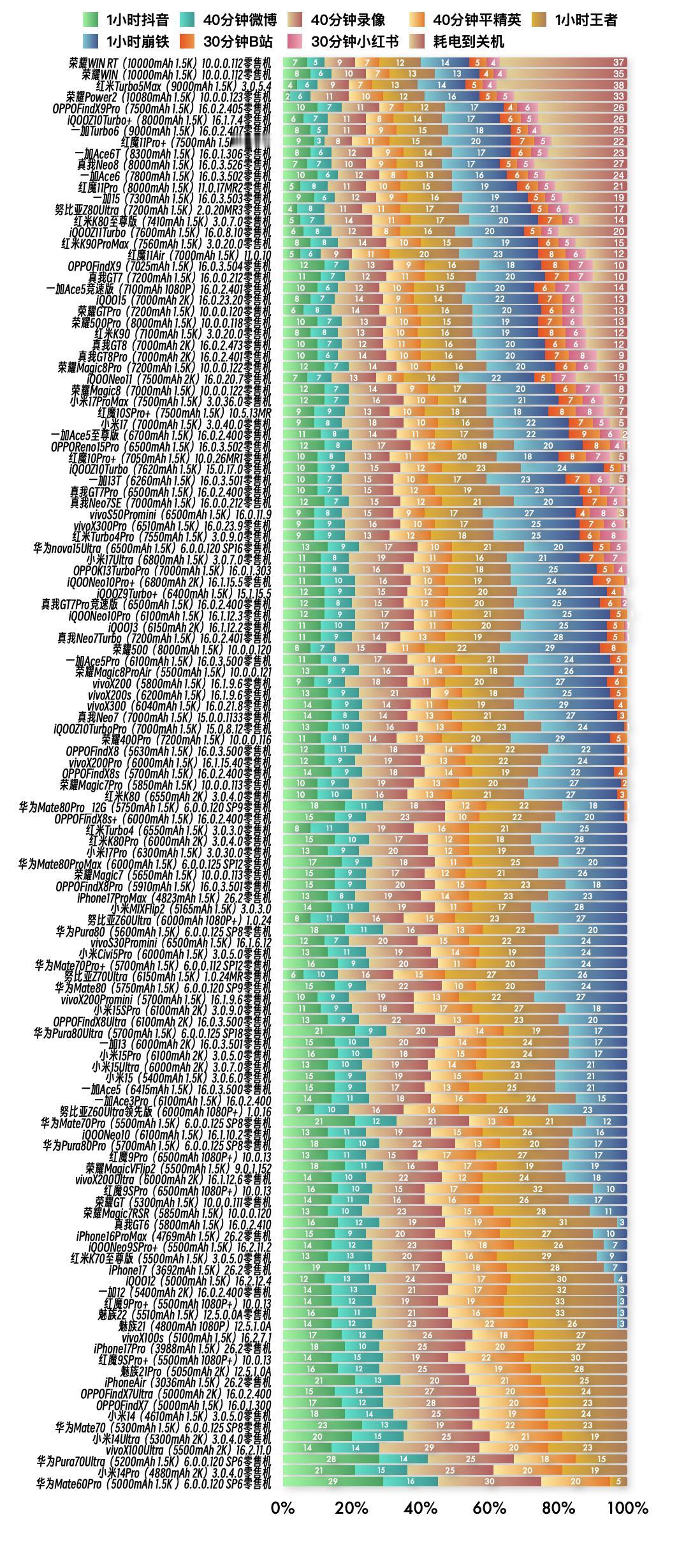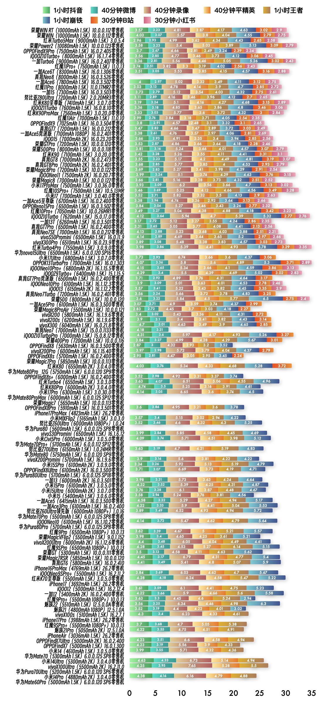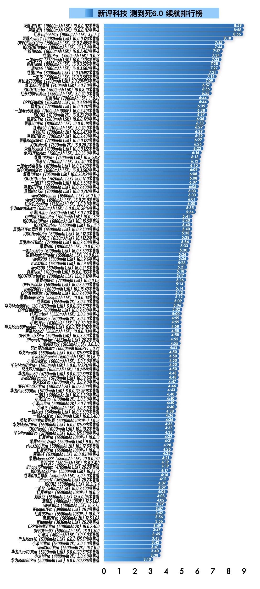 『1月28日最新手机续航榜单』 新评科技续航排行榜 本次6.0标准续航排行榜新增1台手机续航成绩,复测27台手机续航成绩;⭐️完整详细榜单请访问新评科技数据库小程序⭐️ 『6.0标准续航榜单』新增 ① 真我Neo8零售机 16.0.3.526版本总续航时间7小时28分钟,最新排名第10名 『6.0标准续航榜单』复测 ① 一加Ace6零售机 第4次复测 16.0.3.502版本续航时间缩短8分钟,总续航时间7小时27分钟,最新排名第11名【对比历史成绩续航缩短】 ② 一加15零售机 第4次复测 16.0.3.503版本续航时间增加14分钟,总续航时间7小时14分钟,最新排名第13名【对比历史成绩续航增加】 ③ OPPOFindX9零售机 第4次复测 16.0.3.504版本续航时间缩短14分钟,总续航时间6小时44分钟,最新排名并列第18名【对比历史成绩续航缩短】 ④ 红魔10Pro+零售机 第2次复测 10.0.26MR1版本续航时间增加8分钟,总续航时间6小时08分钟,最新排名并列第36名【对比历史成绩续航不变】 ⑤ 一加13T零售机 第3次复测 16.0.3.501版本续航时间缩短3分钟,总续航时间6小时07分钟,最新排名第38名【对比历史成绩续航不变】 ⑥ vivoX300Pro零售机 第3次复测 16.0.23.9版本续航时间增加31分钟,总续航时间6小时01分钟,最新排名第42名【对比历史成绩续航增加】 ⑦ 红米Turbo4Pro零售机 第3次复测 3.0.9.0版本续航时间增加7分钟,总续航时间6小时整,最新排名第43名【对比历史成绩续航不变】 ⑧ OPPOK13TurboPro 第3次复测 16.0.1.303版本续航时间缩短3分钟,总续航时间5小时41分钟,最新排名第46名【对比历史成绩续航不变】 ⑨ iQOONeo10Pro+零售机 第3次复测 16.1.15.5版本续航时间缩短3分钟,总续航时间5小时40分钟,最新排名第47名【对比历史成绩续航不变】 ⑩ iQOO13零售机 第3次复测 16.1.12.2版本续航时间增加15分钟,总续航时间5小时38分钟,最新排名并列第50名【对比历史成绩续航增加】 11 真我Neo7Turbo零售机 第3次复测 16.0.2.401版本续航时间缩短17分钟,总续航时间5小时36分钟,最新排名第52名【对比历史成绩续航缩短】 12 一加Ace5Pro零售机 第2次复测 16.0.3.500版本续航时间缩短1分钟,总续航时间5小时30分钟,最新排名第54名【对比历史成绩续航不变】 13 vivoX200零售机 第2次复测 16.1.9.6版本续航时间缩短1分钟,总续航时间5小时26分钟,最新排名并列第55名【对比历史成绩续航不变】 14 vivoX200s零售机 第2次复测 16.1.9.6版本续航时间缩短7分钟,总续航时间5小时23分钟,最新排名第57名【对比历史成绩续航不变】 15 iQOOZ10TurboPro零售机 第4次复测 15.0.8.12版本续航时间增加3分钟,总续航时间5小时17分钟,最新排名第60名【对比历史成绩续航缩短】 16 OPPOFindX8零售机 第3次复测 16.0.3.500版本续航时间缩短1分钟,总续航时间5小时14分钟,最新排名并列第62名【对比历史成绩续航增加】 17 红米Turbo4零售机 第3次复测 3.0.3.0版本续航时间缩短1分钟,总续航时间5小时整,最新排名第69名【对比历史成绩续航不变】 18 红米K80Pro零售机 第3次复测 3.0.4.0版本续航时间增加4分钟,总续航时间4小时59分钟,最新排名第70名【对比历史成绩续航不变】 19 OPPOFindX8Pro零售机 第2次复测 16.0.3.501版本续航时间缩短9分钟,总续航时间4小时58分钟,最新排名并列第72名【对比历史成绩续航不变】 20 华为Pura80零售机 第2次复测 6.0.0.125 SP8版本续航时间增加2分钟,总续航时间4小时50分钟,最新排名并列第78名【对比历史成绩续航不变】 21 努比亚Z70Ultra零售机 第3次复测 1.0.24MR版本续航时间缩短10分钟,总续航时间4小时50分钟,最新排名并列第78名【对比历史成绩续航缩短】 22 vivoX200Promini零售机 第3次复测 16.1.9.6版本续航时间缩短10分钟,总续航时间4小时48分钟,最新排名并列第83名【对比历史成绩续航不变】 23 OPPOFindX8Ultra零售机 第3次复测 16.0.3.500版本续航时间缩短8分钟,总续航时间4小时46分钟,最新排名第86名【对比历史成绩续航不变】