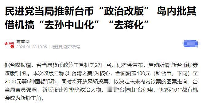 民进党新台币改版“去中国化” !孙中山蒋介石走入历史! 就在1月27日,台有关方面召开记者会宣布,启动所谓“新台币钞券改版”计划。本次改版号称以“台湾之美”为核心,将开放网络投票决定钞票图案走向,台当局官员强调新版设计引发了“去孙中山化”和“去蒋化”的质疑。 这事儿得从根子上说起,新台币从1949年发行到现在,一直承载着两岸共同的历史记忆。就说现在流通的五种面额纸币吧,100元印着孙中山像,200元是蒋介石像,这俩人的历史地位两岸都承认。 可民进党上台后,先是在教科书中大幅删减中国史内容,把郑成功收复台湾都改成“外来政权”,现在又盯上了钞票,这明显是想从文化根基上切断台湾与大陆的联系。 这次改版号称要“去政治人物化”,可背后的政治算计再明显不过。目前流通的500元、1000元、2000元纸币早就没有政治人物了,只剩下100元和200元还保留着孙中山和蒋介石的肖像。 民进党“立委”李坤城之流跳出来呼吁延续无政治人物原则,说是要用自然景观或科技元素彰显“台湾精神”,但明眼人都看得出来,这就是要把象征两岸同属一中的历史符号彻底抹去。 更讽刺的是,民进党当局在推动新版钞票设计时,还把台积电、台北101这些元素列为备选图案,可前脚刚在对美谈判中把半导体产能往美国搬,后脚就想拿这些当“台湾精神”的象征,这不是自打耳光吗? 从历史操作来看,民进党搞“去中国化”从来都是一套组合拳。李登辉时期推动“同心圆史观”,把台湾史从中国史里割裂出去;陈水扁执政时,把“中华邮政”改成“台湾邮政”,中正机场改成“台湾桃园国际机场”;蔡英文上台后,更是直接废除马英九时期的课纲微调,把中国史并入东亚史。 这次新台币改版,不过是他们延续了几十年的“文化台独”策略的又一次升级。国台办早就一针见血地指出,民进党当局为了割裂两岸历史文化联结,花招百出、无所不用其极,但这些政治操弄注定枉费心机,因为两岸同属一中的历史事实改变不了。 再说说经济成本,这次改版可不是小钱。按照台“央行”的说法,新版纸钞平均每张成本5元新台币,一年要更换7亿到10亿张,光这一项每年就得花50亿元新台币,再加上全台ATM机、验钞设备的更新费用,总支出估计超过66亿元。 可现在台湾电子支付普及率越来越高,年轻人用现金的越来越少,花这么多钱改版到底图啥? 岛内民众看得明白,这就是民进党借着“去中国化”捞政治资本,把纳税人的钱当成了他们搞意识形态斗争的工具。有网友直接吐槽:“与其花这冤枉钱,不如把钱用来改善民生,给基层老百姓多发点福利。” 更让人不齿的是,民进党在推动改版时还搞双重标准。他们口口声声说要“去政治化”,可在票选图案里却藏着不少政治隐喻。比如把台北101改成“台湾101”,把台积电包装成“护台神山”,这背后都是想强化“台湾主体意识”。 而且这次网络投票机制也有问题,普通民众根本不清楚选票设计背后的技术细节,很容易被绿营操控舆论。就像之前的“反课纲运动”一样,民进党通过煽动年轻人上街闹事,硬是把原本正常的教育改革扭曲成了政治斗争。 从两岸关系的角度看,民进党这种做法只会加剧台海紧张。大陆一直强调两岸同属一个中国,而民进党却试图通过“去中国化”制造“两个中国”“一中一台”的假象。这种行径不仅违背了国际社会普遍承认的一个中国原则,也严重损害了台湾同胞的根本利益。 国台办多次警告,任何形式的“台独”分裂都不可能得逞,只会把台湾推向危险的深渊。最近大陆在福建舰入列、智能通关等方面的举措,都在释放一个信号:国家统一的历史进程不可阻挡,民进党搞再多小动作也改变不了大势。 说到底,民进党推动新台币改版就是一场“文化自杀”。他们以为通过修改钞票图案、删除历史课本就能改变台湾同胞的民族认同,却忘了文化认同是刻在血脉里的。 台湾的语言文字、风俗习惯、传统节日,哪一样不是中华文化的重要组成部分?就算他们把钞票上的政治人物换成花鸟鱼虫,也改变不了台湾是中国一部分的事实。 历史已经证明,任何逆历史潮流而动的行为都注定失败,民进党如果继续执迷不悟,最终只会被钉在历史的耻辱柱上。
