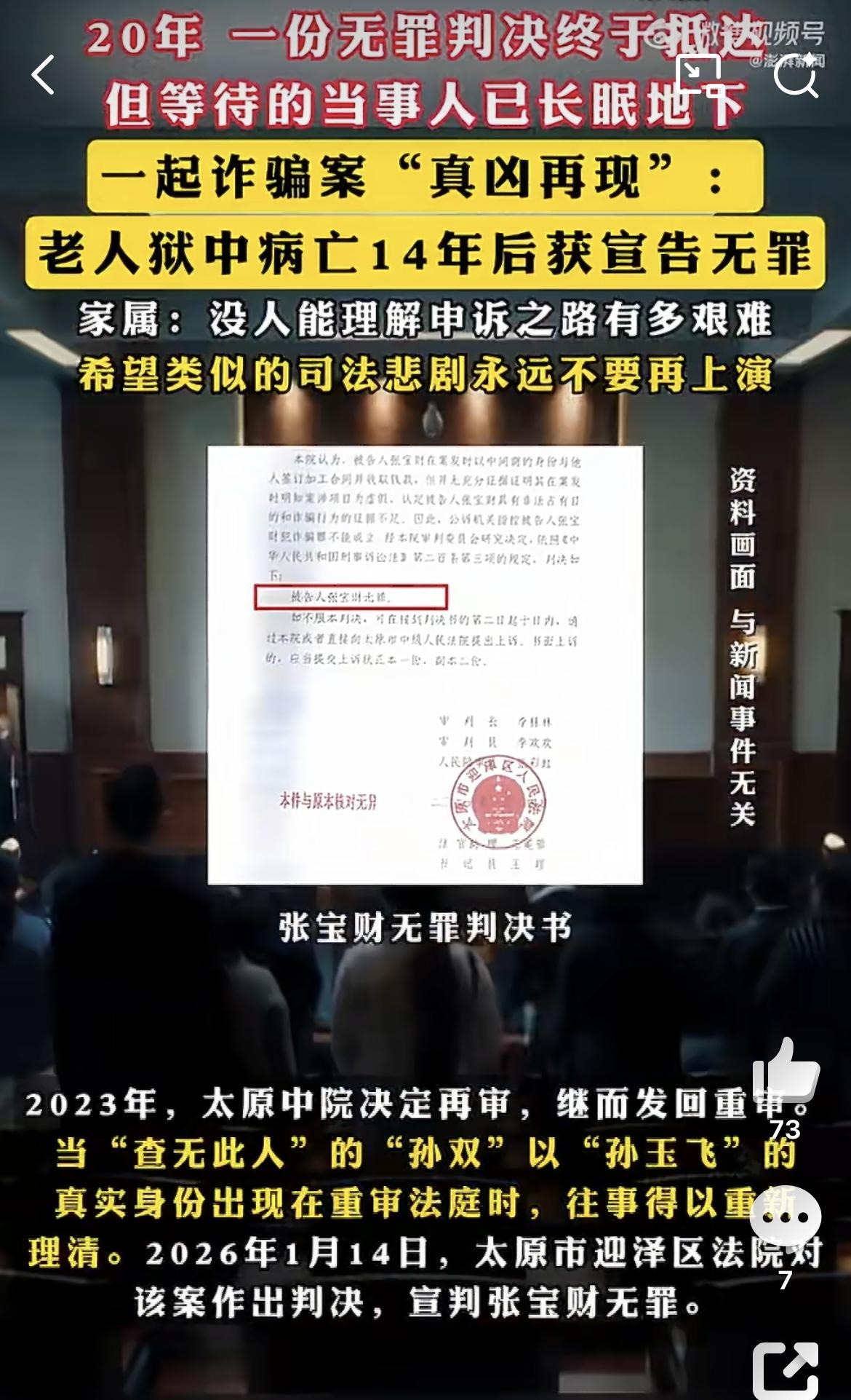 老人狱中病亡14年后获宣告无罪:本案法律责任如何承担? 老人狱中病亡14年后获宣告无罪!二十年,一份无罪判决终于抵达,但等待的当事人,已长眠地下。二十年前,张宝财被卷入一起合同诈骗案。2006年,张宝财被4人指控虚构事实、骗取隔离栅栏款项。他始终坚称自己无辜,钱款交给了上线“孙双”。 该案侦查机关出具证明称,查不到“孙双”该人及其公司。为此,2007年太原市两级法院采信上述证明,认定张宝财犯诈骗罪,判处有期徒刑14年。张宝财孙子张坤宇寻求翻案,他发现“孙双”并非幽灵。其真名孙玉飞,因诈骗罪2011年被捕,2013年被判刑6年!老人狱中病亡14年后获宣告无罪北京刑事律师律师来帮忙 1. 什么机关来承担国家赔偿责任? 在前述案件中,张宝财在狱中含冤病亡,如今终于沉冤得雪。虽然国家赔偿对于张宝财本人已经没有意义,但是,对于其家人来说,也能算上一点安慰。那么,国家赔偿责任由谁来承担并且究竟如何赔偿呢? 首先,老人是在服刑期间病亡,且最终被宣告无罪,那么一般是由作出原生效判决的人民法院作为赔偿义务机关。在前述案件中,该案件历经太原市两级法院审理,做出原生效判决的人民法院是太原市中级人民法院。那么太原市中级人民法院就是本案的赔偿义务机关。 在前述案件中,老人在狱中系病亡,其死亡结果与司法机关的错误判决与羁押之间无直接因果关系。因此,本案赔偿的核心在于对人身自由权的侵犯。侵犯人身自由时,国家赔偿的每日赔偿金按照国家上年度职工日平均工资计算,赔偿金额=被限制人身自由的天数×上年度职工日平均工资。 另外,老人含冤在狱中病亡,也会给家属造成严重的精神痛苦。因此,国家赔偿项目还应考虑到精神损害抚慰金。精神损害抚慰金一般不超过人身自由赔偿金、生命健康赔偿金总额的50%,后果特别严重的可超过50%。 2. 司法工作人员办理冤假错案可能构成犯罪 老人狱中含冤而死令人心痛。司法工作人员在办理此类案件时,若是因其故意或者是重大过失造成冤假错案,其是可能构成犯罪的。 首先,若是司法工作人员在刑事诉讼中,徇私枉法、徇情枉法,对明知是无罪的人而使他受追诉,对明知是有罪的人而故意包庇不使他受追诉,或者在刑事审判活动中故意违背事实和法律作枉法裁判的,可能构成徇私枉法罪。 另外,若是司法机关工作人员在民事、行政审判活动中故意违背事实和法律作枉法裁判,情节严重的,则可能构成民事、行政枉法裁判罪。 最后,若是司法机关工作人员在司法工作中玩忽职守,严重不负责任,致使公共财产、国家和人民利益遭受重大损失的,还可能构成玩忽职守罪。 总的来说,老人狱中含冤而死实在令人心痛。希望将来此类冤假错案越来越少,老百姓真的能够在每一个案件中感受到司法公正。