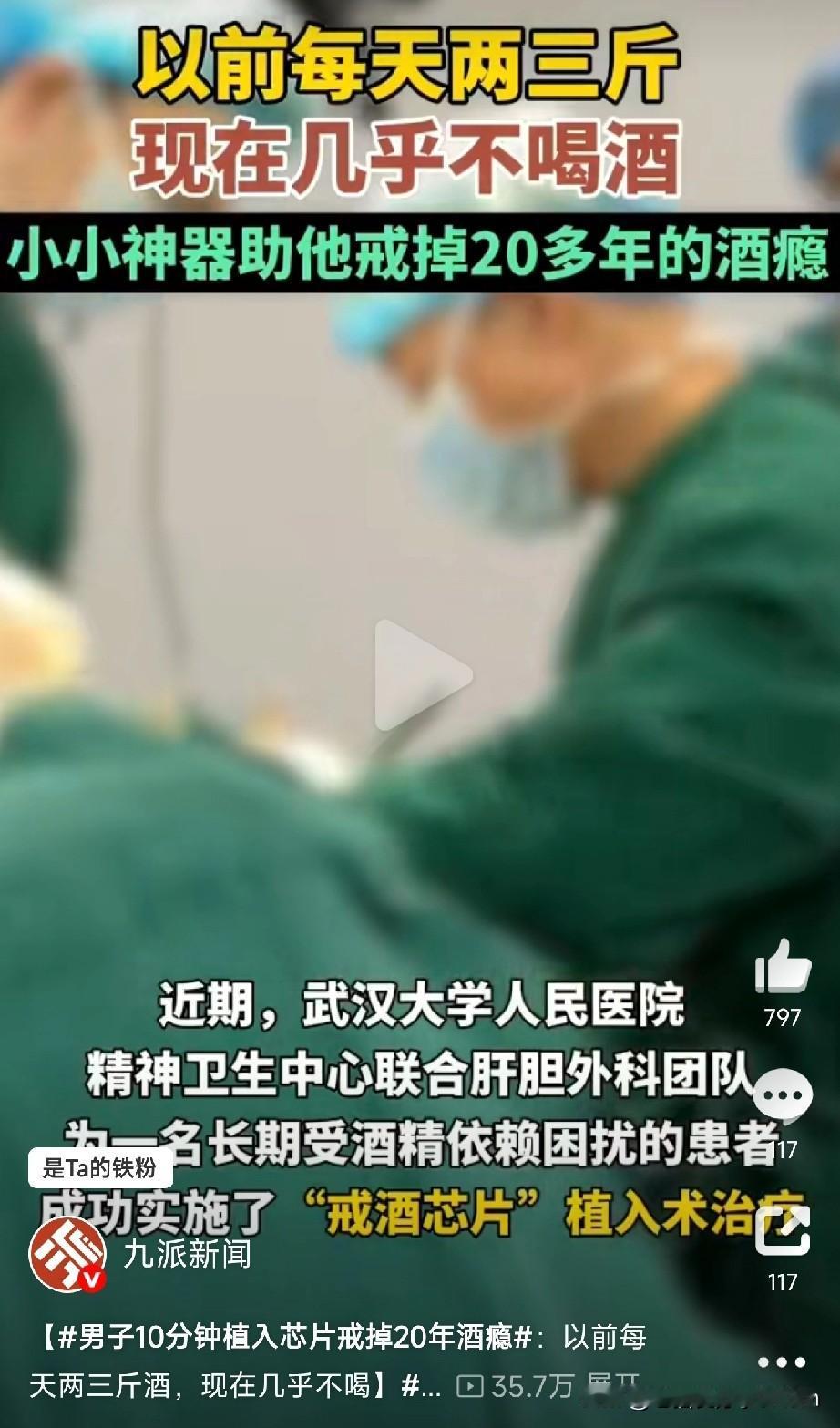 男子植入芯片戒掉20年酒瘾 每天灌下两三斤白酒是什么概念?对48岁的李先生来说,这是过去20年雷打不动的日常。 直到在武汉大学人民医院,医生在他肚脐下方切开一个1厘米小口,埋入一颗“神奇芯片”——一个月后,他面对酒杯竟然无动于衷。 局部麻醉,皮肤切开小口,用止血钳在皮下脂肪层分离出一条“隧道”,再将胶囊状植入剂推入…… 全程仅10分钟,这不是科幻片,而是真实发生的医疗场景。 芯片到底藏着什么秘密? 长效控释:芯片内含戒酒药物盐酸纳曲酮,通过特殊工艺让药效缓慢释放,一次植入管用150天。 靶向阻断:药物持续抑制饮酒产生的欣快感,让人“喝了也不快乐” 。 解决了传统口服药容易漏服的弊端,芯片植入后“一劳永逸”。 精神科主任强调:“芯片不是魔法棒。”戒酒需要药物+心理+家庭+社会四重支持: 植入后仍需定期心理疏导。 家人要创造无酒环境。 患者需建立新的社交圈。 培养健康替代活动(如运动、爱好)。 该技术目前主要针对重度酒精依赖患者,需严格评估后实施。普通人群预防更重要—— 每周酒精摄入不超过100克。 避免“每天来二两”的习惯。 警惕用酒精缓解压力。 技术进步让人惊叹,但健康生活才是根本! (文章素材来自九派新闻,侵删)
