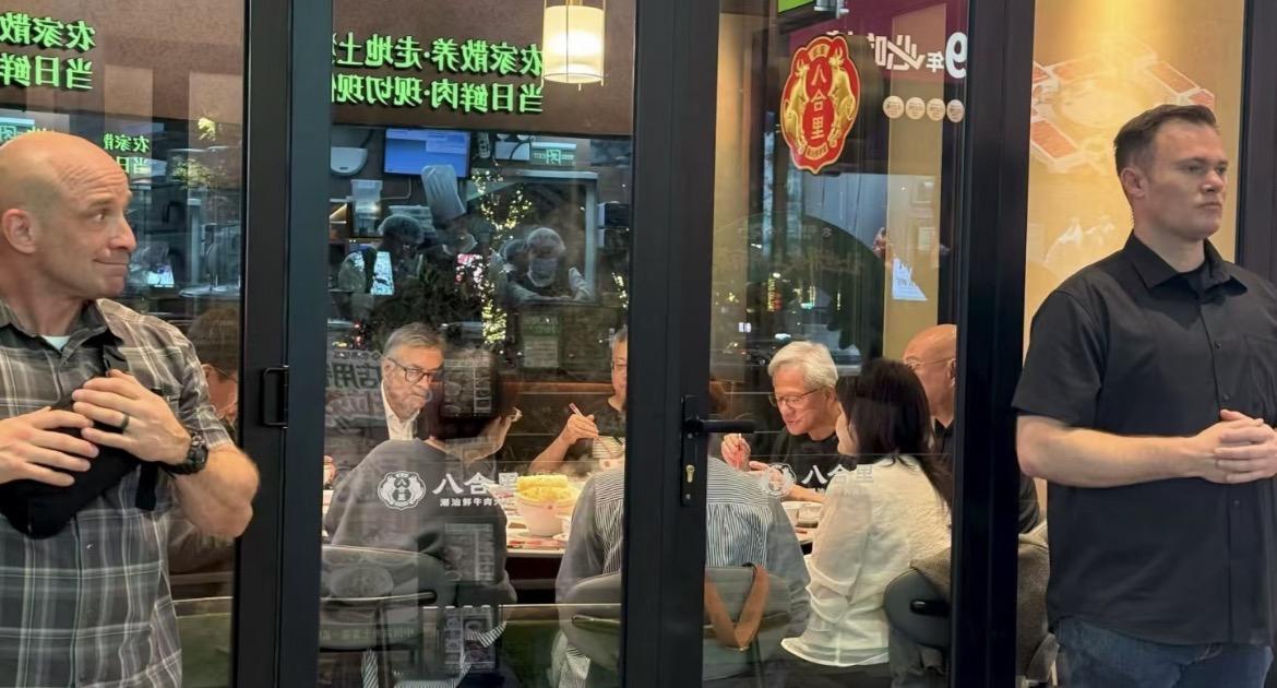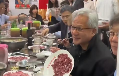 黄仁勋为火锅店“代言”! 1月27日晚,英伟达CEO黄仁勋现身深圳,在知名潮汕牛肉火锅品牌“八合里”用餐。席间,他兴致勃勃地拿起盘中切好的鲜牛肉拍照留念,神情轻松愉快。 饭后,店员直接拿着门店宣传单与“老黄”合影,大佬也欣然应允。这操作等于免费请来了身家千亿的科技巨头为自家店铺代言。网友笑称:“八合里这波赢麻了!” 事实上,老黄此次中国:可谓是从上海一路“吃”到深圳,展现了他对中华美食的热爱。(PS:老黄的保镖很敬业)