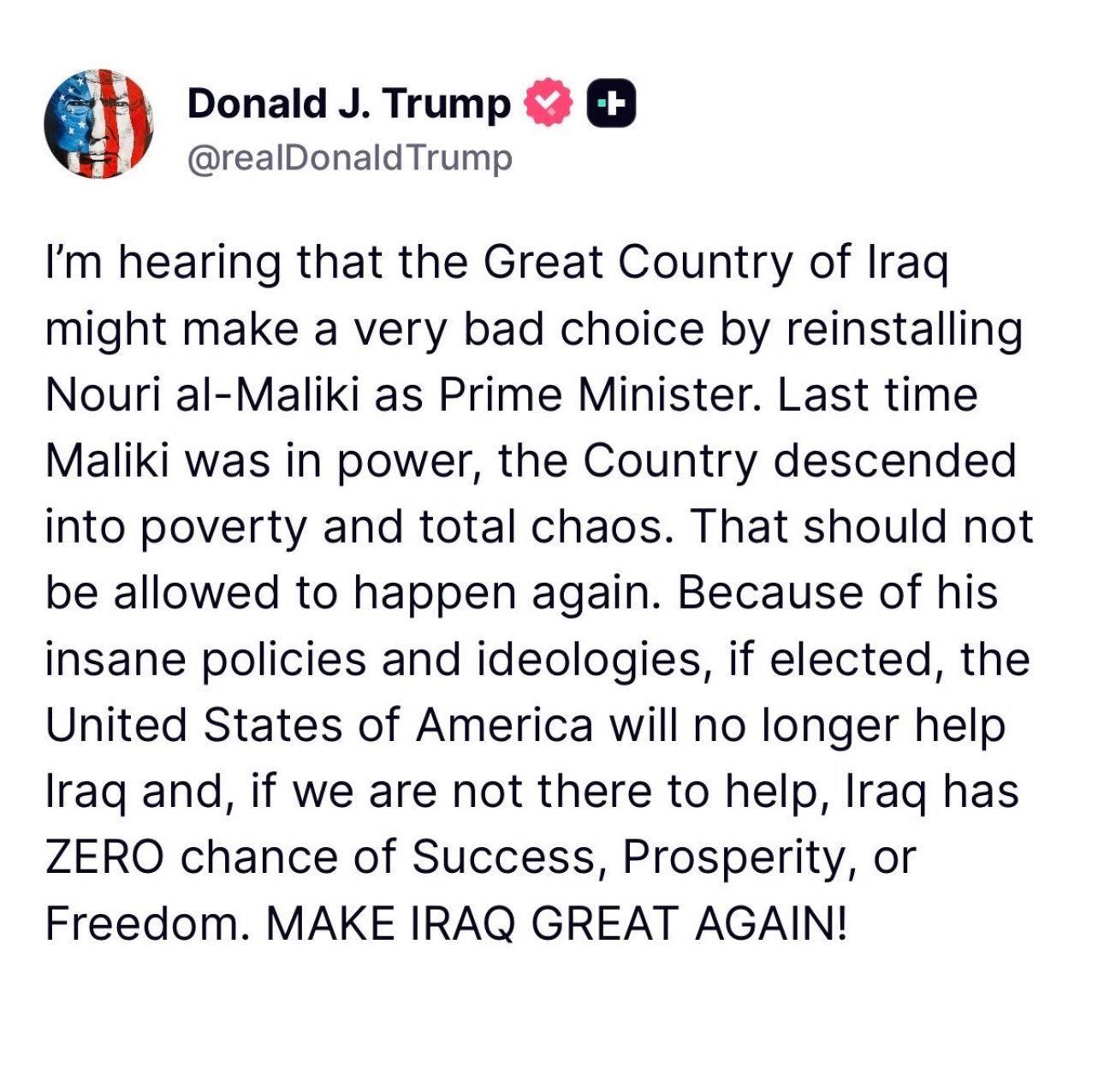 🔻特朗普威胁伊拉克。🔻“让伊拉克再次伟大!”🔻via realdonladtrump美国前总统反对美国现政府海外新鲜事热点现场