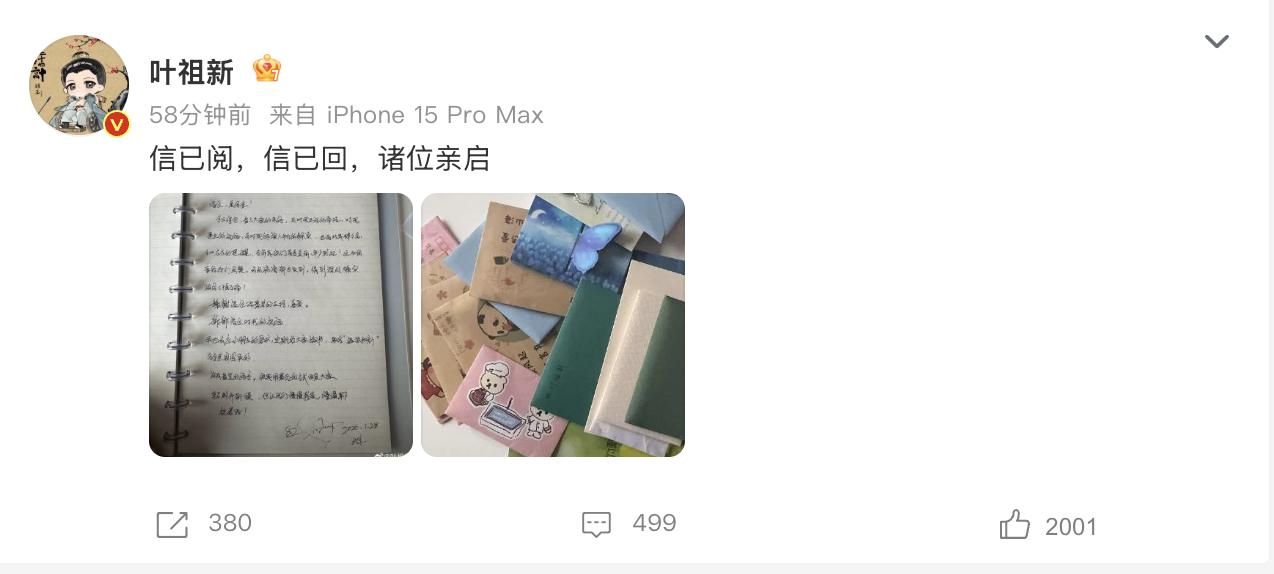 叶祖新手写信回应粉丝 看了粉丝的信,并手写了一封信回应粉丝。