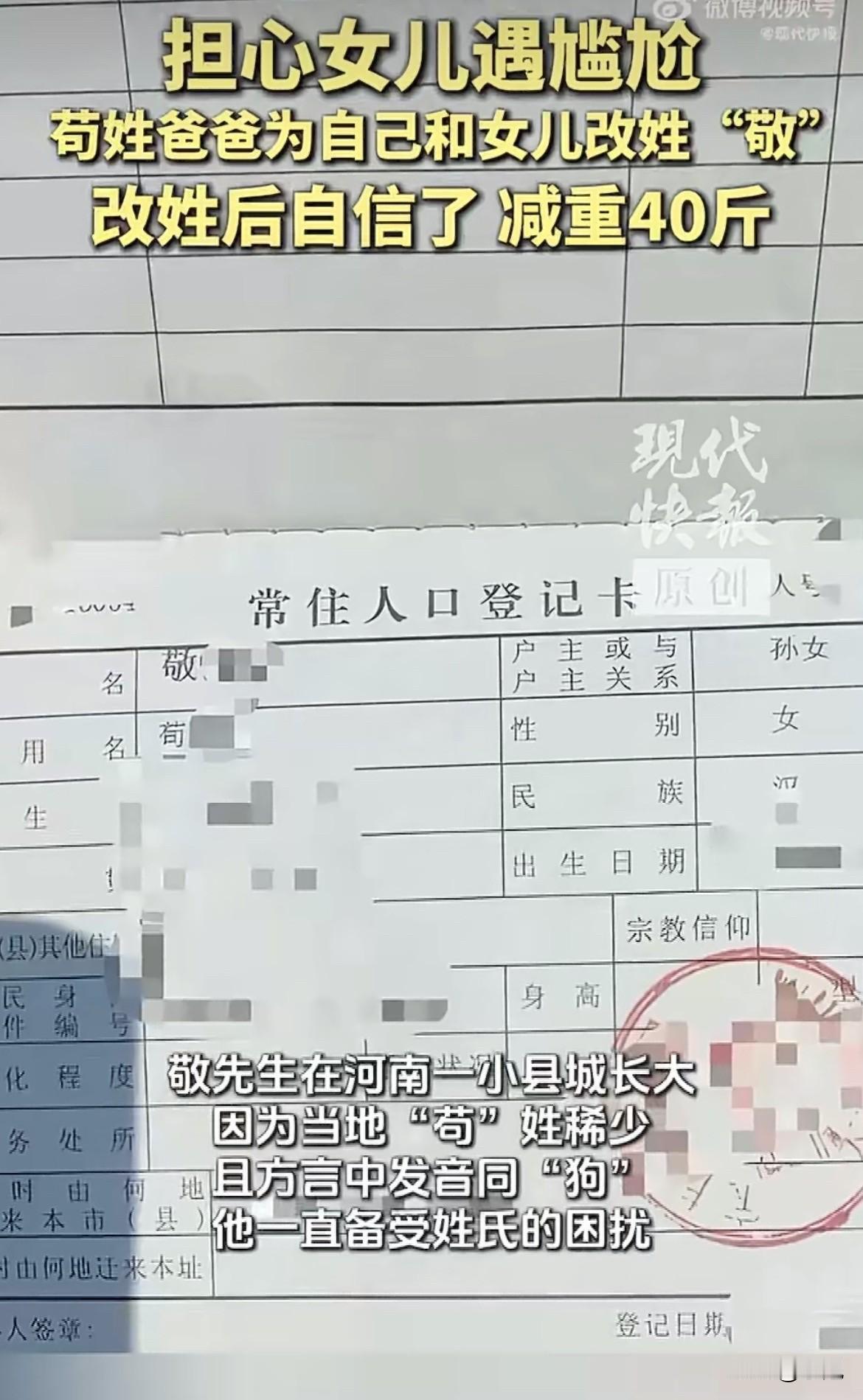 一位父亲决定改掉自己的姓。不是他一个人改,是带着小女儿一起改。从“苟”改成了“敬”。这个念头,在他心里压了三十年。 他说,在河南老家,这个字在方言里读出来,总让他从小抬不起头。学校里同学起外号,他为这个没少打架。那种感觉,像影子一样跟着他。 等到自己有了孩子,这根刺扎得更深了。九年前大女儿出生,随他姓。可孩子快上学时,他改了主意,让大女儿随了母姓“徐”。他怕。 怕孩子再走一遍他的老路。 小女儿出生后,他把自己取的名字发到网上,没想到招来一片骂声。很多网友说他“不负责任”,这名字“可能会影响孩子一生”。那几个晚上,他根本睡不着。 他听说陕西老家有人改成功过。妻子一出月子,他就开始行动。查案例、写申请、回老家派出所盖章,材料一层层交上去,从镇里到县里,再到市里、省里。 前前后后三个月。批下来的时候,小女儿都已经一岁了。 接着是更琐碎的事。电话卡、银行卡、结婚证……所有印着旧姓的地方,一样样去更新。接到派出所电话,让他去拿新身份证时,他第一反应是不敢信。 三十年的心事,就这么了了。 他说,这件事过去后,他觉得自己什么都能做成。这股劲推着他,从190斤减到了150斤,瘦了整整40斤。 但是,同样的路,不是谁都能走通。 就在去年八月,四川遂宁一位苟姓女士,同样申请改姓“敬”,就被拒绝了。官方回复很明确:她父亲、祖父都姓“苟”,母亲和外婆家也没有“敬”姓,这不属于法律允许的“选取其他直系长辈血亲的姓氏”。 那位女士解释说,不只是因为谐音难听,而是祖上本就姓“敬”,想恢复祖姓。但公安机关查遍了档案,没能找到她和敬姓长辈亲属关系的证明。相关部门最后说,如果能通过公证或亲缘鉴定证明直系长辈里有姓“敬”的,就可以办。 你看,一样是想摆脱谐音的尴尬,一个成功了,带着女儿开启了新生活;另一个却卡在了证明材料上,暂时无解。 根据《民法典》,公民有权依法变更姓名,但得遵守规矩。最常见的同意改名理由里,就包括“姓名用字实属不雅,字音字义有辱人格”这一条。敬先生能成功,恐怕不仅仅是“谐音”问题,他回原籍地寻找历史渊源和案例,这很可能成为了关键。 一个姓氏,改或不改,背后都是一个家庭漫长的思量,有时还是一场奔波的开始。 如果你是这位父亲,你会不惜代价去改掉一个带来困扰的姓氏吗?还是觉得,应该试着让周围人学会尊重每一个普通的姓氏?