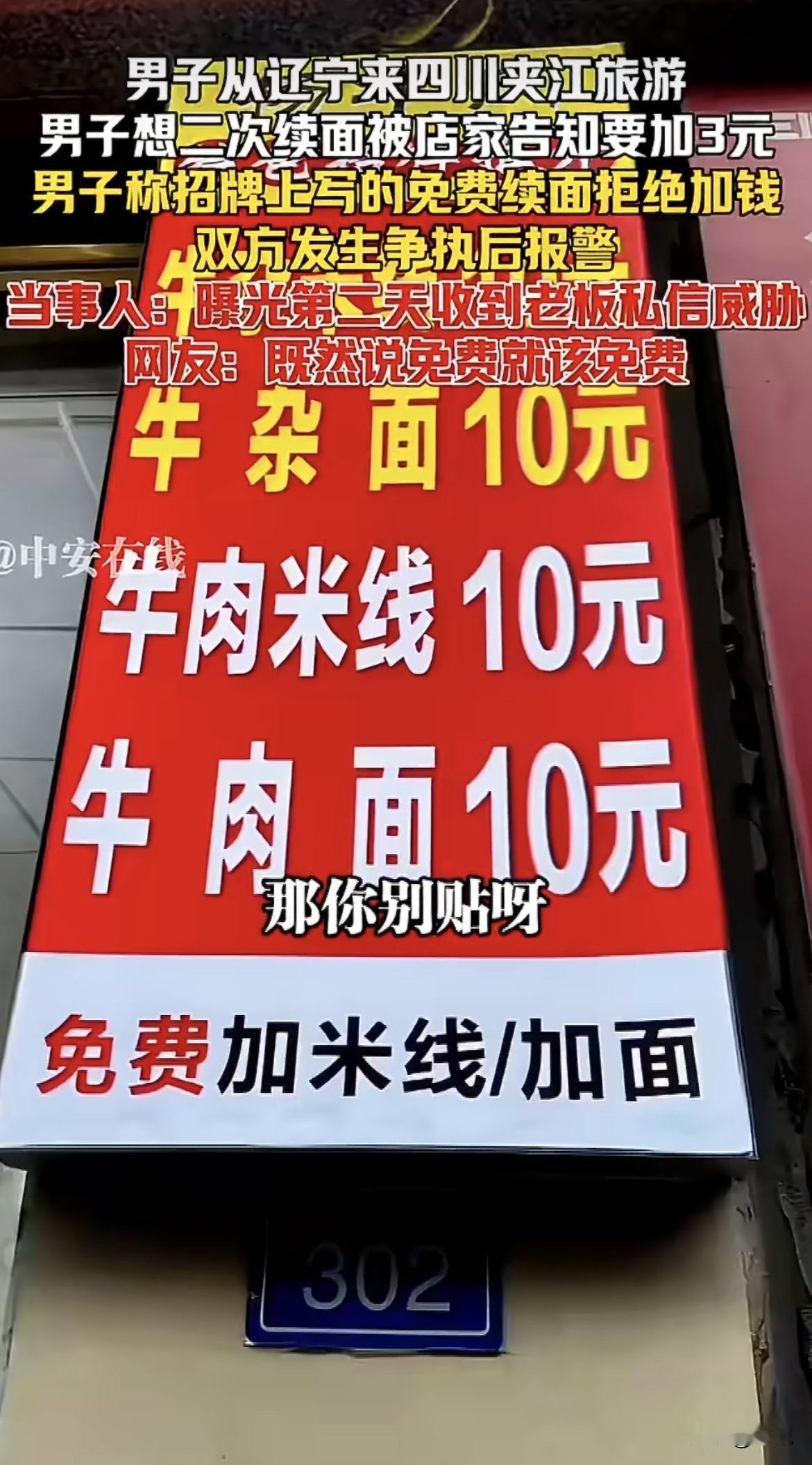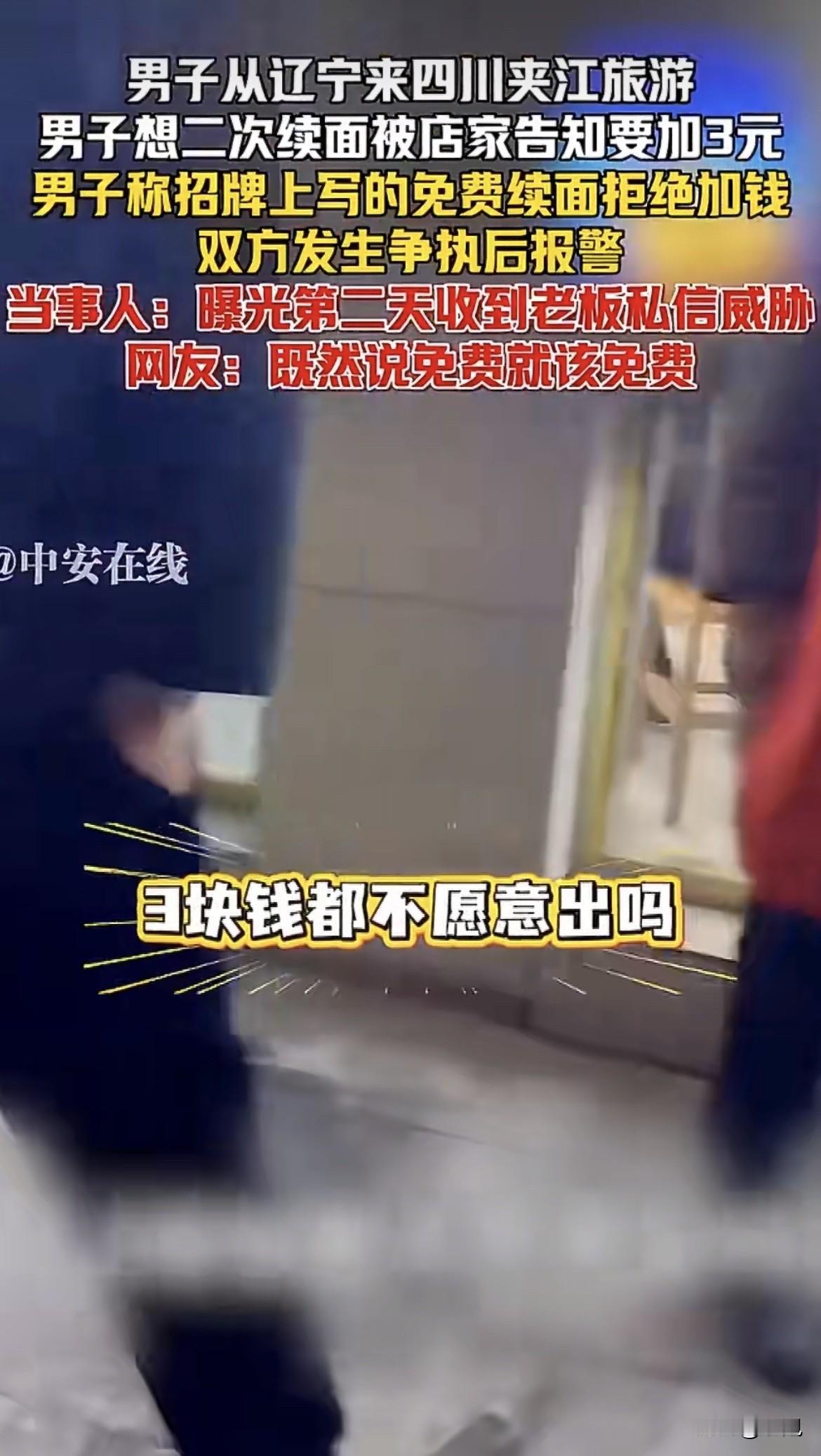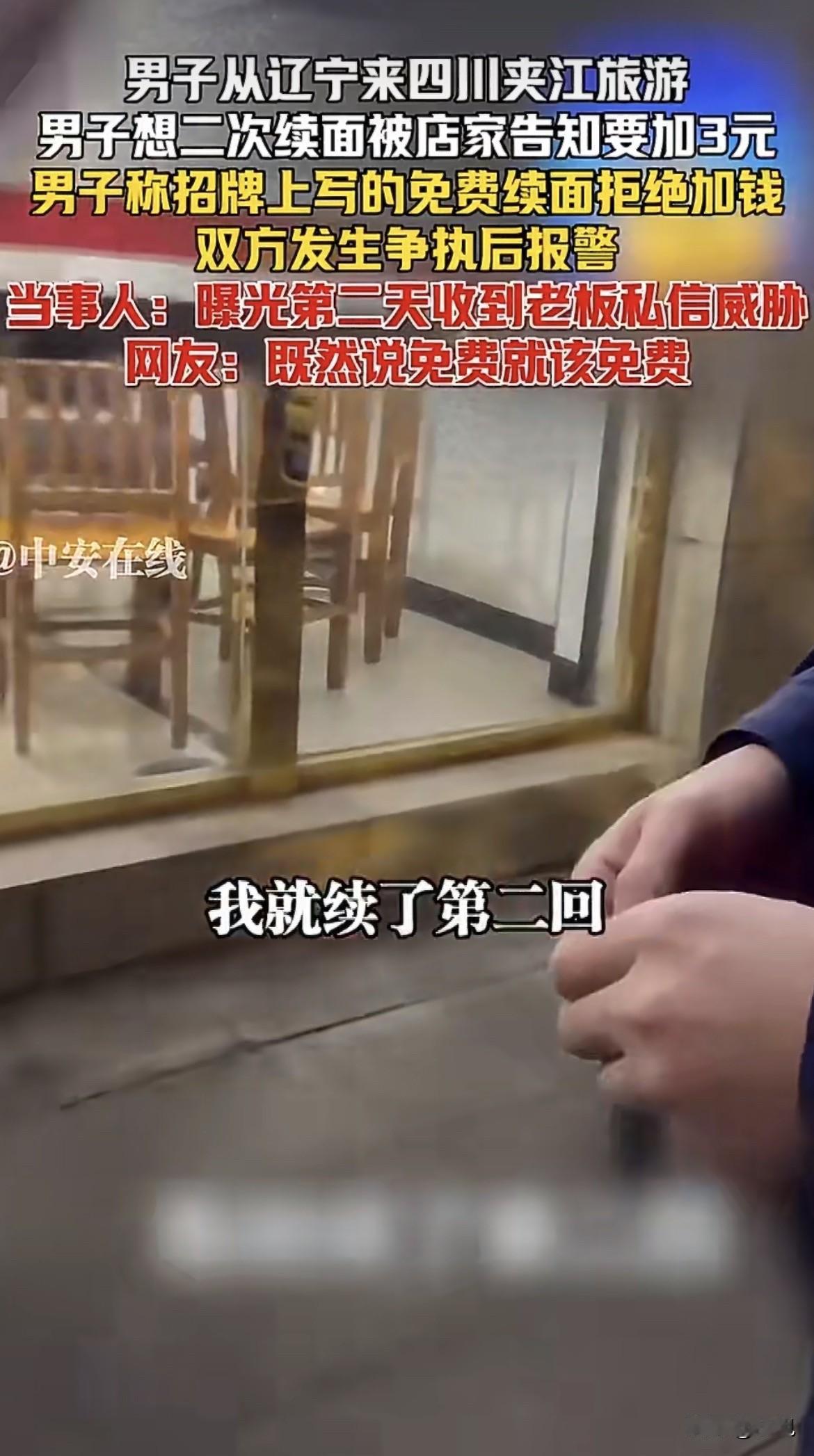 一碗十块钱的面,免费加面的招牌红得显眼。就为了再加一次面多收三块钱,顾客和老板闹到了报警。警察来了甩出一句:“三块钱还不够我油费。” 从辽宁来四川乐山夹江旅游的邢先生,拉着行李箱,看见了这块“免费加面”的招牌。十块钱一碗牛杂面,挺实惠。他吃完一碗,招呼一声,店员顺手就给加了一次,没二话。 一碗面下肚,他没饱。空碗递过去,要再加第二次。 这回,老板开口了:“兄弟,再续要给三块。” 邢先生愣住了,指着招牌问,你这上面没写次数啊?老板回了一句,写了免费加面,又没说无限。 一方觉得被套路了,招牌就是个诱饵。一方觉得碰上了硬茬,要把小店吃垮。空碗搁在那儿,话顶话,谁也不让。 邢先生掏出手机,想拍下来评理。老板一看,动作更快:“你要打12315,我就打110。” 报警电话比投诉电话先拨了出去。 警察来了,是两位辅警。了解情况后,一位辅警笑着打圆场,话是冲着邢先生说的:“不就3块钱嘛,还不够我来回油钱,我替他给了,散了散了。” 就是这句“油钱都不够”,被邢先生的手机录了下来。这句话像颗火星子,掉进了油锅里。 现场还有个穿棉袄的大叔,突然往邢先生手里塞了十元现金,说:“拿去吧,别堵门口。” 邢先生事后说,那种感觉像被施舍,心里更不是滋味了。 最后,他没吃那第三碗面,拿着店家退还的十元餐费走了。但事情根本没完。 视频到了网上,炸了。网友吵翻了天。 有人说,招牌没写次数,就是无限续,这是白纸黑字的契约。有人说,免费续一次是情分,再续就是过分,小本生意不容易。还有人说,不管谁有理,执法者这句“油钱不够”和“垫钱平事”,味道不对。 事情闹大了。夹江县网信办指出,涉事商家确实存在“误导消费的嫌疑”。市场监督管理局也介入调查。 那位说“油钱不够”的辅警,后来给邢先生打去了电话,为当时言语不当道了歉。 有人给小店算了笔账:一碗面卖十块,净利润可能也就两块左右。加一次面的生面成本,差不多就要一块三。老板们也有苦衷,要是把“限一次”写得太大太明,怕客人推门就去隔壁了。 风波一起,夹江县市监局突击检查了城里三十多家面馆,真发现有六家“免费加面”没写明次数,当场要求整改。有的店家连夜在招牌底下贴了张A4纸,补上一行小字:“每人限一次,限一两。” 涉事面馆的老板,把那张红招牌拆了。他说,新招牌要直接印上:“加面2元一次。” 明码标价,谁都别猜。 那个辽宁来的年轻人已经离开了乐山。他在电话里讲,他要的不是那三块钱,是一个清清楚楚、明明白白的规则。 一场三块钱的风波,照出了好多东西。照出了小店生存的精细算盘,照出了消费者对“模糊地带”的较真,也照出了一句话可能掀起的意想不到的波澜。 现在,好多“免费”后面,都跟上了细细小小的说明。一碗面可以续,但信任和规矩,最怕模棱两可的试探。 这场因为三块钱加面费引发的争执,从店里闹到网上,从个人纠纷变成公众话题,你怎么看?