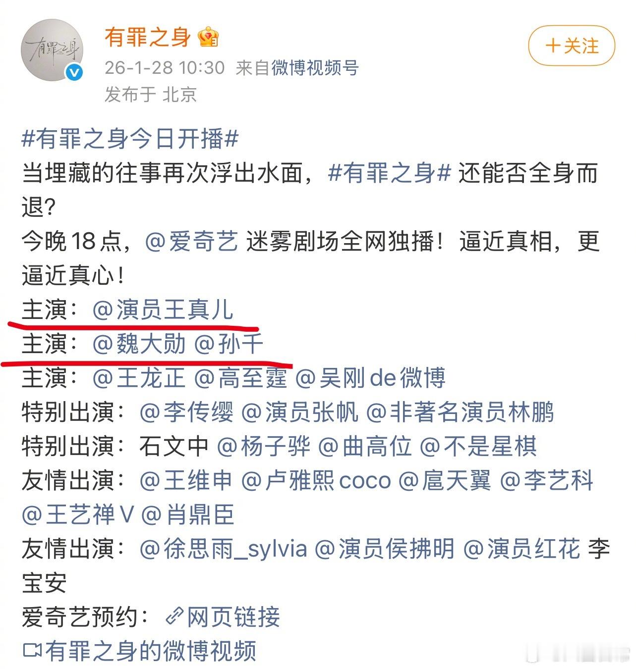 因为《有罪之身》王真儿压番魏大勋和孙千,魏大勋粉丝要求保证魏大勋各平台第一顺位王真儿发微博:都是为了大家辛苦创作的剧能被看到!才有了现在的一个呈现。谁是真正的一番大家都心知肚明!祝我们一番大男主魏大勋大女主孙千《有罪之身》开播大吉王真儿回应压番魏大勋孙千王真儿压番魏大勋孙千