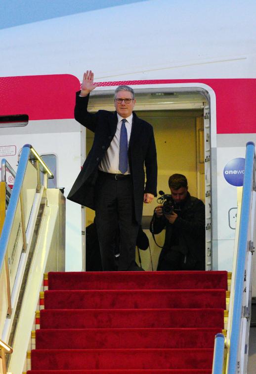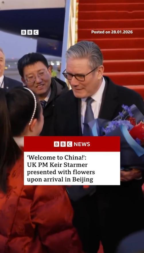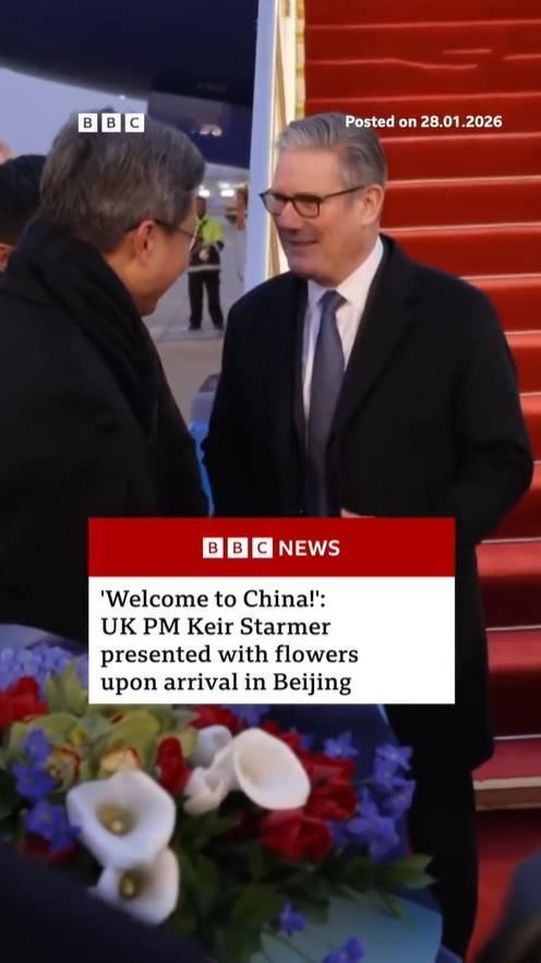 1月28日外媒BBC报道斯塔默抵达北京画面!英国首相身后的舷梯铺着的红毯很抢镜,中方接机人员上前打招呼,还贴心的说“你这穿的有点少啊”!然后斯塔默还摸了摸自己的高定风衣,好像是说我的衣服很保暖。 接机人员见到英国首相嘘寒问暖十分热情,献花小朋友用英语欢迎斯塔默访华,这一幕画面很温暖,被英国媒体报道,就是不知道英国观众看了会怎么想? 从外媒拍的照来看,英国首相确实穿的单薄,也就一件风衣+白衬衫,并没有穿毛衫或者什么内搭衣服,而且首相先生为了风度,下飞机的时候还没有系扣,敞开怀的穿搭有风度没有温度呀!
