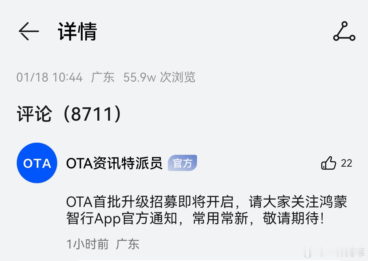 评论区有问什么时候开始招募,刚看到鸿蒙智行APP里官方已经表示升级招募即将开启,大家可以留意一下APP,开启招募了及时报名,就能优先推送啦~