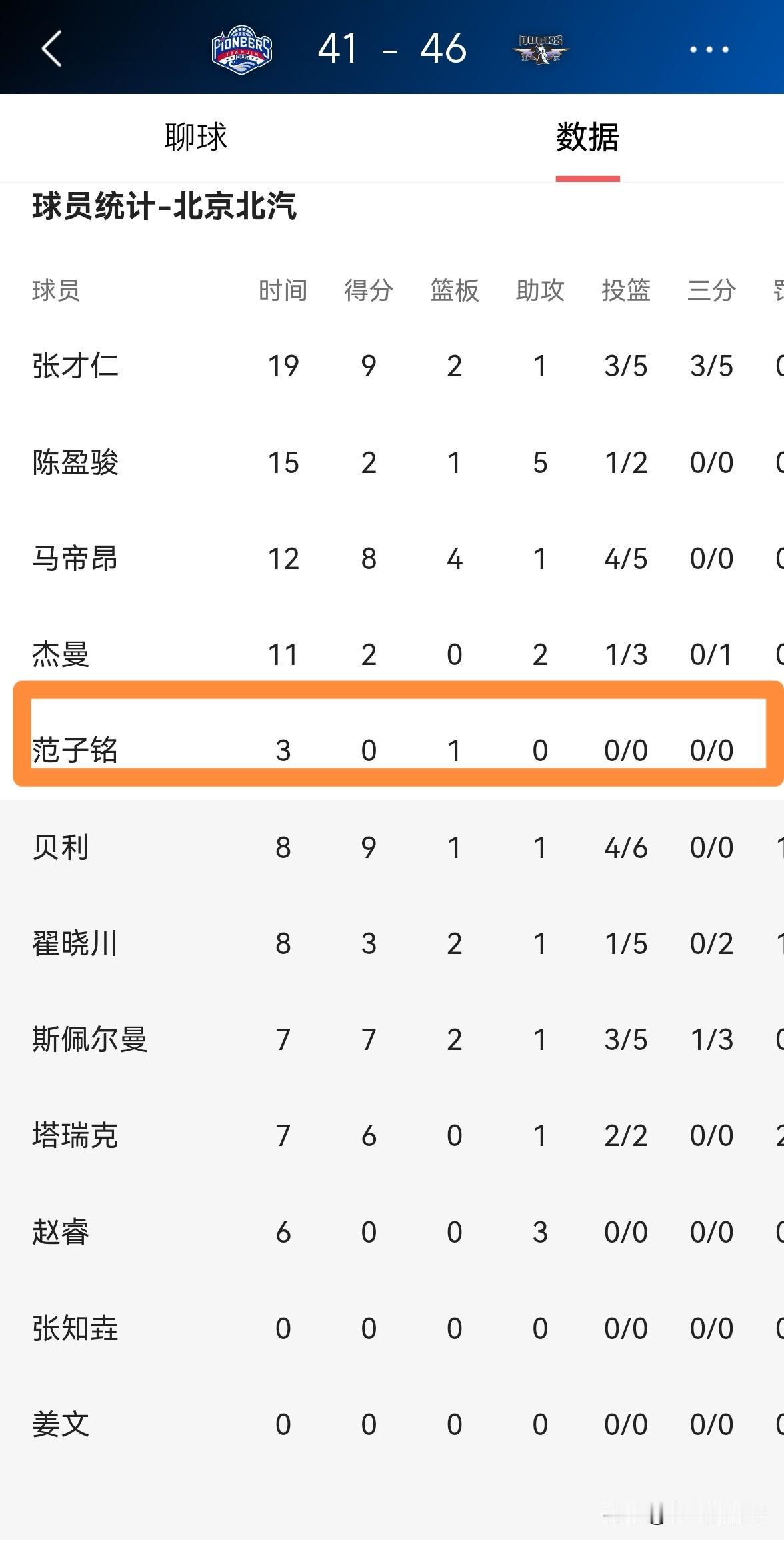 北京北汽大将范子铭真是太可怜了!在今天北京北汽客场挑战天津先行者的比赛中,目前双方的上半场比赛已经结束,北京北汽暂时以46:41领先对手。值得一提的是,在前两节比赛中,范子铭仅仅首发出战3分钟,就惨遭主帅许利民的弃用,他在首发出战的3分钟里没有出手怒砍0分,有1篮板1抢断1犯规,他的场上正负值为+1。 虽然范子铭贵为顶薪球员,但是他在北京北汽的处境真的挺可怜,因为只要范子铭在场上效果不好,他就会惨遭弃用。