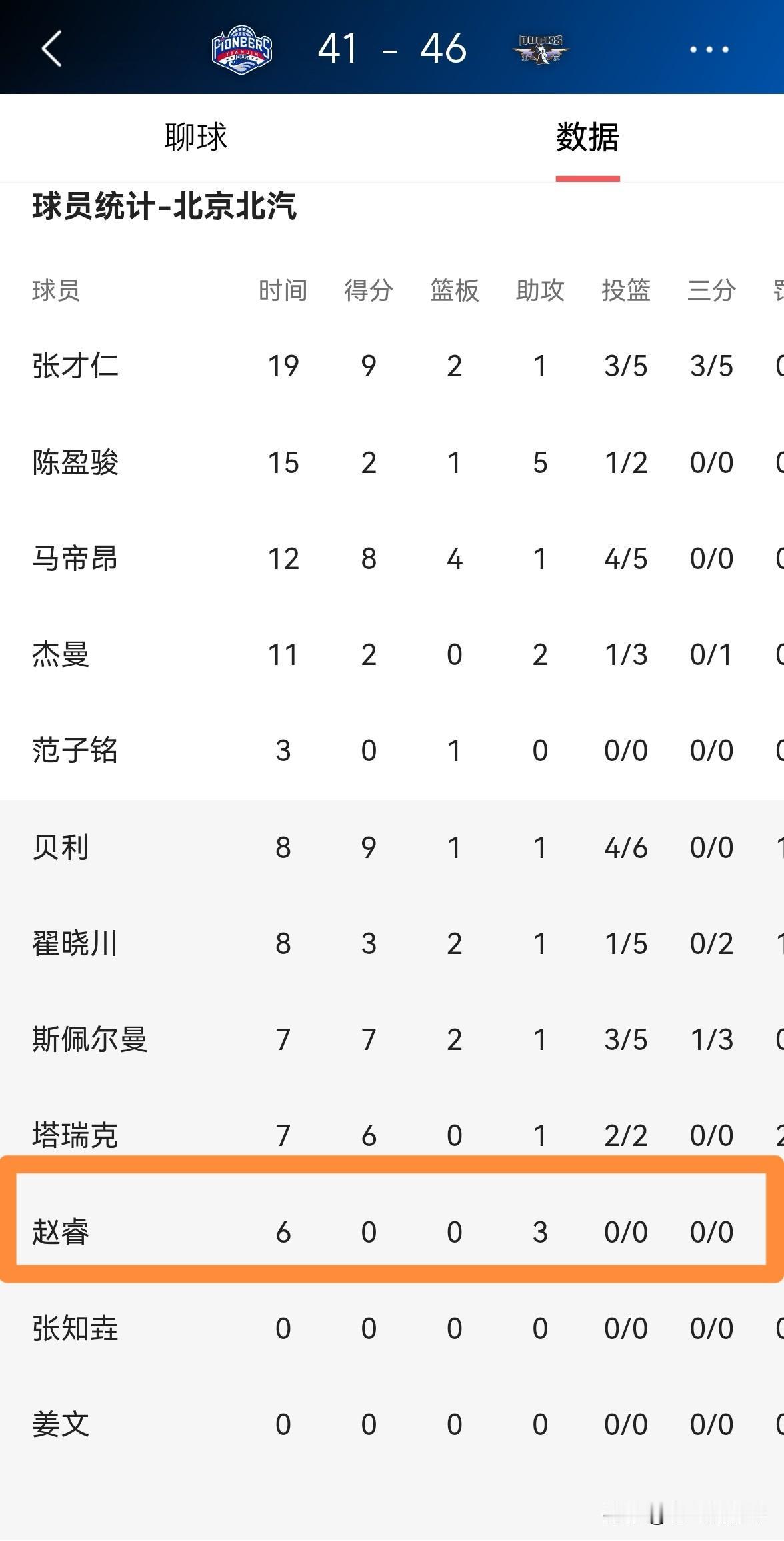 北京北汽当家控卫赵睿真是满血归来!在今天北京北汽客场挑战天津先行者的比赛中,目前双方的上半场比赛已经结束,北京北汽以46:41领先对手5分。在前两节比赛中,赵睿专注于组织串联和防守,他在替补出战的6分钟里,没有出手得到0分,不过有3助攻1抢断,没有出现失误和犯规,他的场上正负值为全队最高的+5。 从赵睿在上半场比赛中的表现来看,虽然他的状态还没有恢复到最佳水准,但是已经非常棒了。