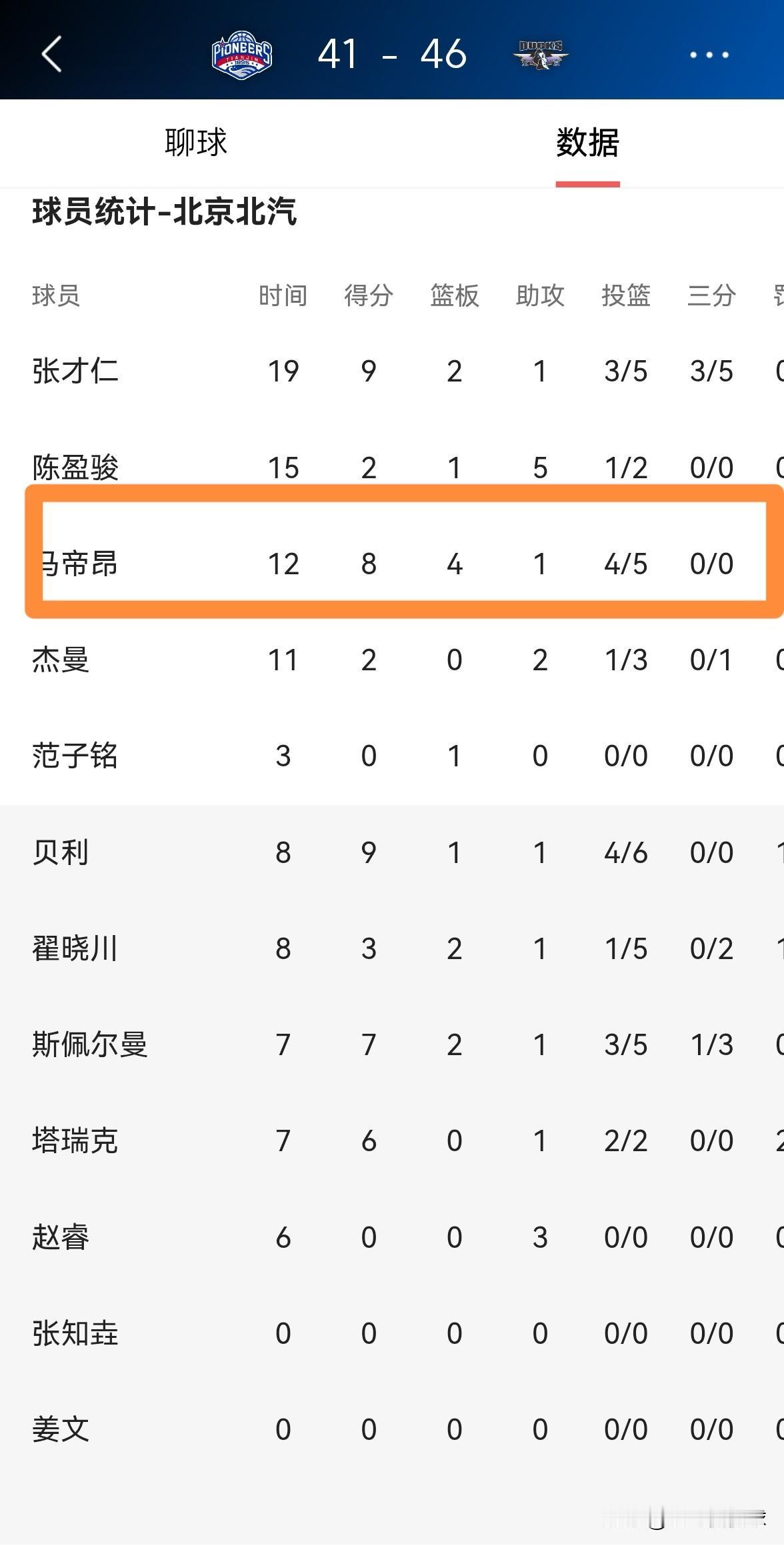 北京北汽外援马帝昂真是太高效了!在今天北京北汽客场挑战天津先行者的比赛中,目前双方半场战罢,北京北汽以46:41领先对手5分。在前两节比赛中,马帝昂首发出战12分钟,投篮5中4非常高效的砍下8分,还有4篮板1助攻1盖帽,他的场上正负值为+2。 虽然马帝昂的进攻手段比较单一,但是他在篮下吃饼的能力确实非常强,这让他总能打出非常高效的表现。