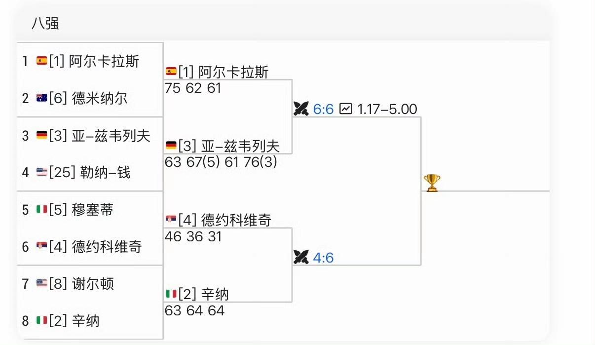 迪米和穆塞蒂真是难兄难弟!只能说老天都偏心药加辛,天气过热药加辛抽筋,却幸运启动高温规则;半决赛又遭遇老慢的德鸡,一顿暴打肯定走不了。 2025温网1/8决赛:迪米特洛夫6-3/7-5/2-2辛纳时退赛,辛纳最终夺冠。 2026澳网1/4决赛,穆塞蒂6-4/6-3/1-3德约时退赛,德约科维奇?