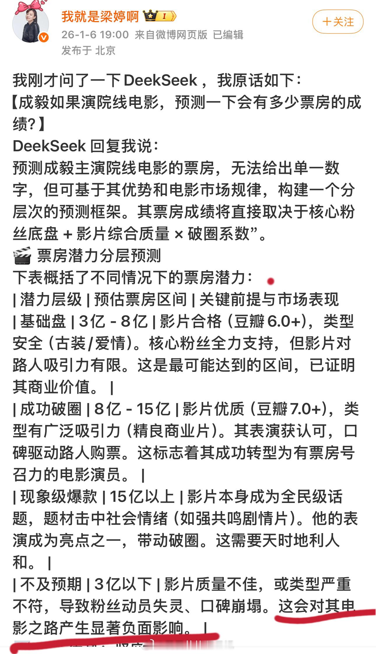 成毅这个前老板发微博说,如果他这部电影票房3亿以下,会影响成毅未来的电影之路。话