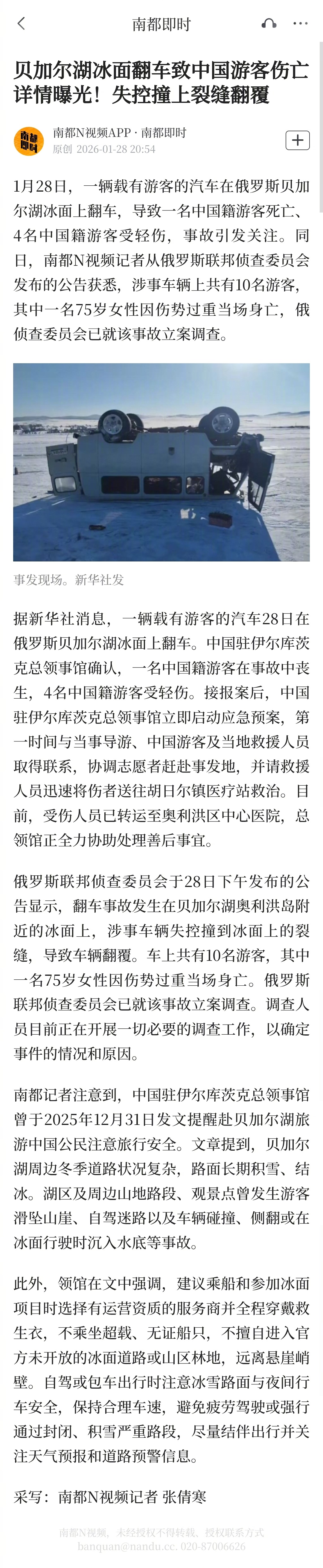 #贝加尔湖车祸中国游客伤亡详情曝光#【贝加尔湖冰面翻车致中国游客伤亡详情曝光!失控撞上裂缝翻覆】#1名中国籍游客俄罗斯死亡#1月28日,一辆载有游客的汽车在俄罗斯贝加尔湖冰面上翻车,导致一名中国籍游客死亡、4名中国籍游客受轻伤,事故引发关注。同日,南都N视频记者从俄罗斯联邦侦查委员会发布的公告获悉,涉事车辆上共有10名游客,其中一名75岁女性因伤势过重当场身亡,俄侦查委员会已就该事故立案调查。据新华社消息,一辆载有游客的汽车28日在俄罗斯贝加尔湖冰面上翻车。中国驻伊尔库茨克总领事馆确认,一名中国籍游客在事故中丧生,4名中国籍游客受轻伤。接报案后,中国驻伊尔库茨克总领事馆立即启动应急预案,第一时间与当事导游、中国游客及当地救援人员取得联系,协调志愿者赶赴事发地,并请救援人员迅速将伤者送往胡日尔镇医疗站救治。目前,受伤人员已转运至奥利洪区中心医院,总领馆正全力协助处理善后事宜。俄罗斯联邦侦查委员会于28日下午发布的公告显示,翻车事故发生在贝加尔湖奥利洪岛附近的冰面上,涉事车辆失控撞到冰面上的裂缝,导致车辆翻覆。车上共有10名游客,其中一名75岁女性因伤势过重当场身亡。俄罗斯联邦侦查委员会已就该事故立案调查。调查人员目前正在开展一切必要的调查工作,以确定事件的情况和原因。