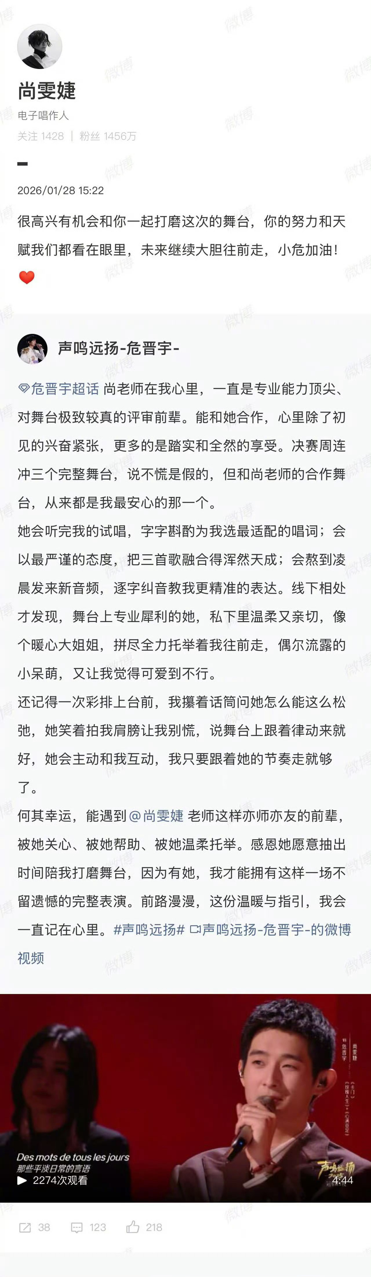 危晋宇夺冠发文感谢尚雯婕危晋宇夺冠第一波感谢给到尚雯婕!专业上是熬夜改音频、逐字抠发音的严师,私下里是暖心提点的前辈,这份亦师亦友的缘分也太好磕了~小危的冠军里藏着导师的用心,未来继续合作炸场舞台,狠狠期待了声鸣远扬