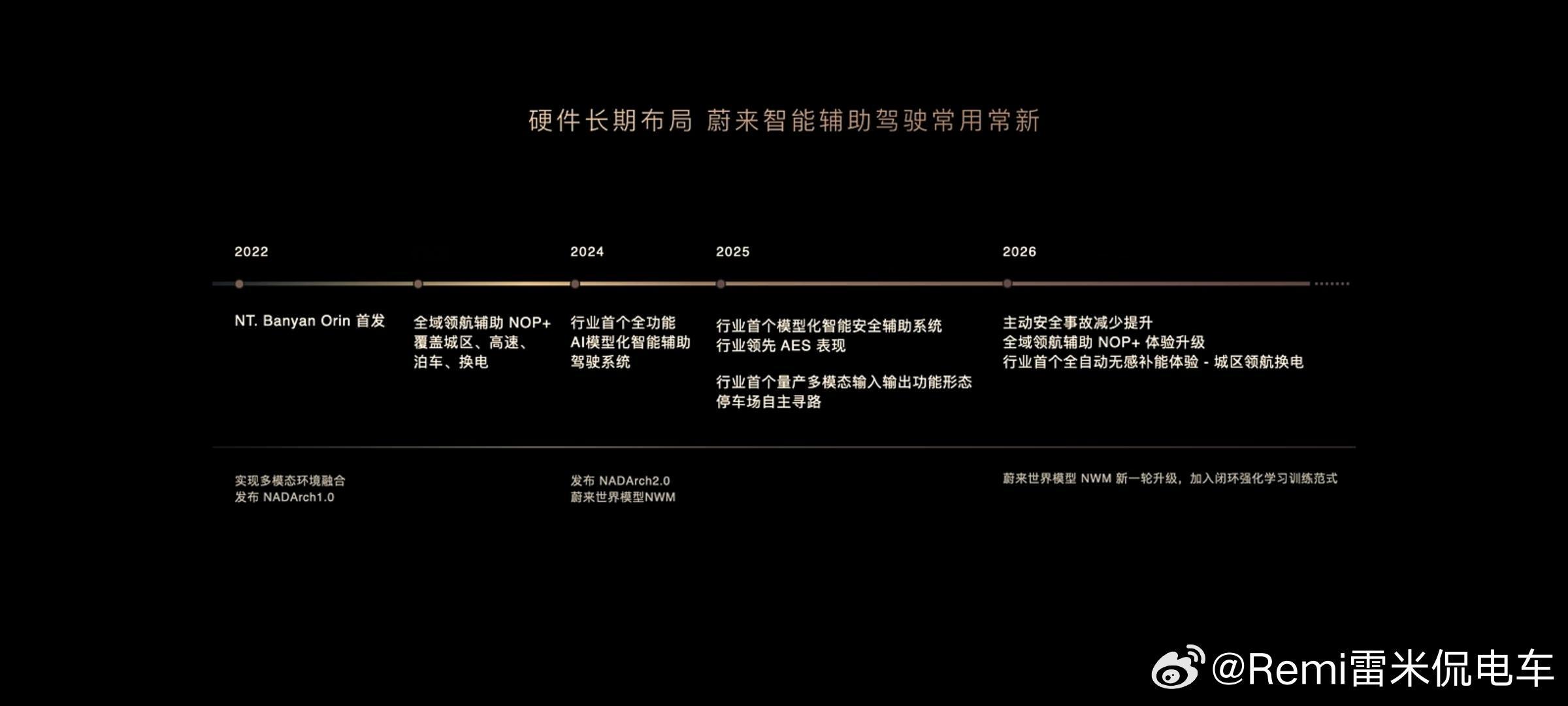 蔚来智驾的Roadmap,其实回顾历史,蔚来智驾其实一直都是遥遥领先的,只是刚好端到端产生价值的时候,蔚来正在打磨更高阶的世界模型,那段时间确实能力不足,但是再安全方面还是有场景化的价值体现,而现在世界模型将会发挥其架构的先进性。蔚来汽车