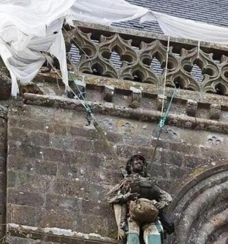 1944年,一名伞兵因失误,被挂在法国的一个教堂上,当德军发现他的时候,他装死骗过了德军,可他应该也没想到这次装死,竟然让他在教堂上“挂”了75年。 麻烦各位读者点一下右上角的“关注”,留下您的精彩评论与大家一同探讨,感谢您的强烈支持! 1944年6月6日凌晨,诺曼底登陆战役打响。 在规模浩大的“霸王行动”中,美军第82空降师作为先遣部队,深入德军后方执行空降任务。 二等兵约翰·斯蒂尔就在其中。 他绝未料到,自己此行的终点并非预定的田野,而是法国小镇圣米歇尔-埃格利斯的一座教堂钟楼,并因此经历了一段被载入史册的离奇遭遇。 当天深夜,斯蒂尔与战友们从颠簸的C-47运输机中跳出。 然而,强劲的侧风、地面的防空火力以及夜色中的混乱,使许多伞兵严重偏离了预定着陆点。 斯蒂尔不幸被风吹向小镇中心。 更糟糕的是,下方一栋建筑被流弹击中起火,为躲避烈焰,他竭力操控降落伞,却径直撞上了镇中心圣米歇尔教堂的石头外墙。 降落伞伞绳死死缠绕在钟楼外侧的雕塑和排水管上,将他悬挂在距离地面约二十米的高空中,动弹不得。 此刻,脚下的小镇已陷入激战。 警报嘶鸣,德军士兵在街道上奔跑、射击。 斯蒂尔发现自己被悬在战场最醒目的位置,成了绝佳靶子。 他试图割断伞绳,但匕首在挣扎中坠落。 随即,德军发现了他,枪声响起,一颗子弹击中了他的脚部。 在极度危险且完全无助的情况下,斯蒂尔做出了唯一可能保命的选择:装死。 他立刻垂下头,让身体彻底松弛,伪装成一具被击毙后挂在半空的尸体。 在接下来的漫长数小时里,斯蒂尔以这种独特而痛苦的方式,“参与”了诺曼底登陆日的初始战斗。 他忍受着脚伤的剧痛、绳索的勒缚、高空的风寒以及巨大的心理恐惧,必须保持绝对静止。 他悬挂在那里,目睹了下方街道的激烈交火,看到不远处有战友在落地时中弹。 时间在枪炮声中缓慢流逝,每一分钟都是对意志的极限考验。 天色渐亮,战斗暂歇,德军开始清扫战场。 士兵们将悬挂在教堂上的斯蒂尔解下,并确认其为“阵亡者”,将其与其他被俘及受伤人员安置在一起。 实际上,斯蒂尔因重伤和长时间悬挂导致极度虚弱,但意识尚存。 几天后,他抓住德军看守松懈的时机,成功逃脱,并历经周折,最终找到了正在附近作战的美军部队。 归队养好伤后,斯蒂尔以更大的斗志重新投入战斗,参与了后续的多场战役。 因作战英勇,他累计击毙11名敌军,俘虏30余人,荣获铜星勋章和紫心勋章,证明了自己是一名真正的战士。 战争结束后,他回到美国伊利诺伊州,过起普通人的生活,对自己那段尴尬又惊险的经历,多年间绝少向人提起。 转机出现在1957年。 爱尔兰记者科尼利厄斯·瑞恩为撰写诺曼底登陆的著作《最长的一天》,向众多老兵发信询问一个简单问题: “1944年6月5日午夜你在哪里?” 斯蒂尔在回信中简短写道: “挂在圣米歇尔-埃格利斯教堂的钟楼旁边。” 这段离奇的经历立刻引起了瑞恩的极大兴趣,并被详细写入书中。 随着书籍的畅销及1962年同名电影的上映,约翰·斯蒂尔的名字和他那不可思议的故事传遍了世界。 最富温情的致敬来自故事发生地。 法国圣米歇尔-埃格利斯小镇的居民从书中得知,当年的“教堂伞兵”不仅活着,还成了战斗英雄。 他们用一种独特而略带幽默的方式纪念这段历史: 在圣米歇尔教堂的外墙上,当年斯蒂尔悬挂的大致位置,永久安置了一个身着美军伞兵制服、背着降落伞的逼真模型。 这个模型一挂数十年,成为小镇最著名的地标。 此外,小镇还在教堂内设计了一扇特殊的彩绘玻璃窗,上面描绘的并非宗教圣像,而是圣母俯视下,几位美军伞兵凌空而降的场景,将这段历史永恒铭刻。 约翰·斯蒂尔于1969年去世,但他的形象以这种特殊的方式,永远“悬挂”在了诺曼底的记忆里。 他的故事并非典型的冲锋陷阵的英雄叙事,而是一个关于绝境求生、关于战争中小人物独特命运的传奇。 它提醒人们,历史由无数或壮烈、或奇异、或平凡的瞬间交织而成,每一个瞬间都值得被看见和尊重。 主要信源:(中时新闻网——二战最狂伞兵 竟挂在教堂上逾70年)