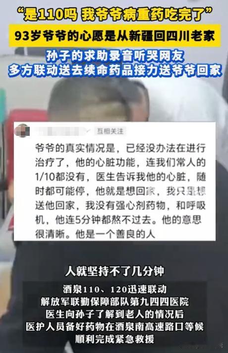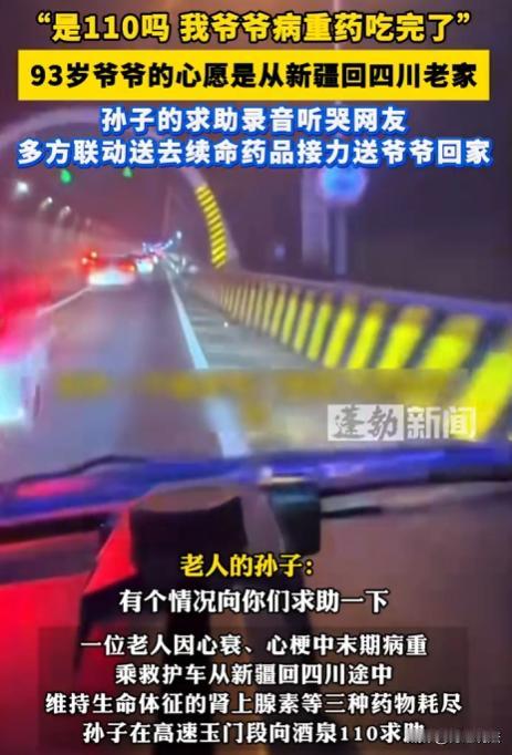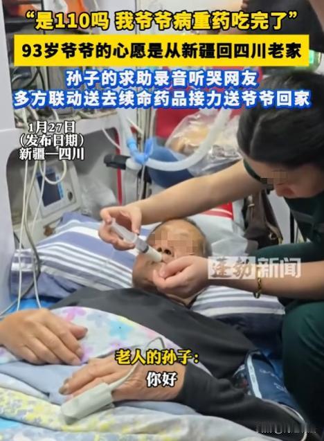 新疆,有位退伍老兵,他93岁的爷爷生命垂危,却执念要回四川老家。男子决定满足爷爷心愿,带着爷爷踏上归途。可途中强心药耗尽,老人生命危在旦夕,男子无奈报了警求助。没想到,公安、卫健、高速交警等多方紧急联动,展开一场送药护航行动,最终顺利帮老人圆了回家梦。 (本信息来源于:蓬勃新闻) 据报道,小李退伍后在新疆生活,他爷爷93岁,患有心脏衰竭严重。 爷爷清醒时总念叨四川老家,那是他一生的牵挂。 小李看着爷爷期盼的眼神,决定带他回四川,开启跨越三千多公里的归乡之旅。 小李连夜收拾行李,第二天就带着爷爷出发,一路上,他寸步不离守着爷爷,时刻关注爷爷状况。 这三千多公里,承载着老人对家乡的思念,也让小李满心担忧。 半路上,意外还是发生了。 爷爷日常服用的强心药没了,这药对维持爷爷生命至关重要,没了药老人撑不过一小时。 小李看着昏迷不醒的爷爷,慌了神,最终报了警进行求助,向民警说明了情况。 警方接到求助,深知时间就是生命,迅速行动起来。他们马上联系卫健部门和高速交警。 卫健部门接到通知,紧急协调药房调配药品,确保能最快拿到药,药房里,工作人员争分夺秒调配,仔细核对每个环节,不敢有丝毫马虎。 高速交警则规划送药路线,安排警车开道。他们根据实时路况,选最优路线,避开拥堵路段。急救车在一旁严阵以待,司机随时准备出发。 很快,药品调配好,急救车拉上药就风驰电掣驶向小李所在位置。 在各方紧密配合下,药品及时送到小李手中。小李接过药,连忙给爷爷喂药。药效发挥作用,老人生命体征慢慢稳定,转危为安。 经过一路奔波,小李带着爷爷回到四川老家。 老人看到熟悉的山水、房屋,眼中闪烁泪光,脸上露出欣慰笑容,心愿达成,这场跨越千里归乡之旅圆满结束。 依据《民法典》第182条,因紧急避险造成损害,由引起险情的人担责。危险是自然原因引起,紧急避险人不担责,可适当补偿。紧急避险措施不当或超限度,造成不应有损害,要担适当责任。 小李为救爷爷求助,合理,有权获相关部门紧急救助。 公安、卫健、高速交警等多方联动部门,他们有紧急救助义务。 《人民警察法》第21条规定,人民警察遇公民人身、财产安全受侵犯或处于危难情形,要立即救助。对公民解决纠纷要求,要给予帮助。对报警案件,要及时查处。公安部门接求助后迅速行动,协调资源,是履行法定职责。 卫健部门调配药品,也是职责所在。 《基本医疗卫生与健康促进法》规定,建立基本医疗卫生制度,保障公民获基本医疗卫生服务权利。卫健部门协调药房,确保患者及时救治,是履行职责。 这场跨越三千多公里归乡之旅,让我们看到亲情力量,小李为满足爷爷心愿的孝心,让人感动。 大家对这件事有什么看法,欢迎在评论区留言讨论。