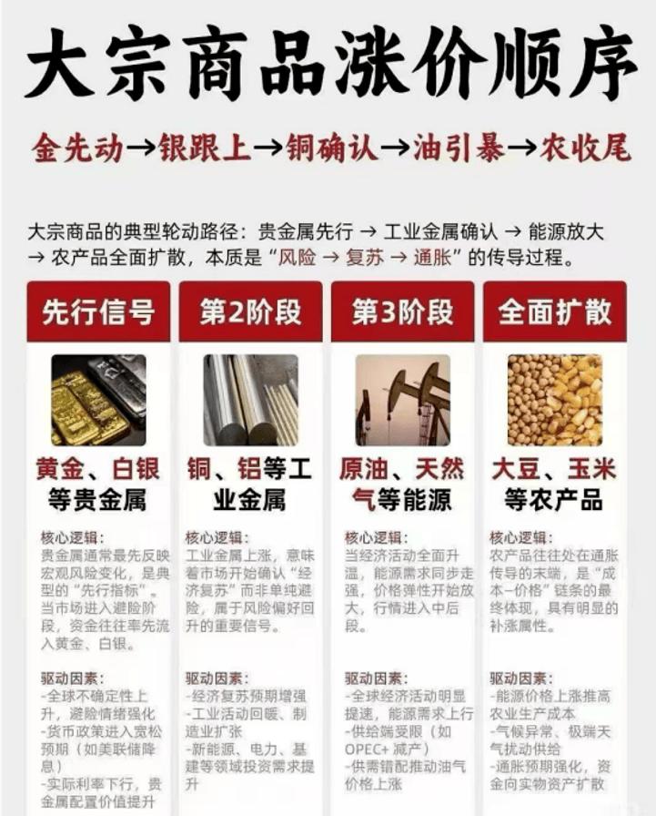 大宗商品是全球定价,明天股民看到金银涨了,肯定又猛干有色周期股了! 所以,这个降温有一定作用,但不是决定性的。目前贵金属的逻辑很简单,就是全球的流动性泛滥了。过去几年全球超发的资金都去股市了,现在需要找一个新的蓄水池!不局限于贵金属,也会往下游传导。 等所有上游原材料都涨了,向下游传导的时候,就是通胀。有了通胀就有消费品的上涨,房价自然上涨,那时候资金又可以去楼市了!消费股也会涨。最后连生活物质都涨价,所以大家还是多赚钱吧。 一般商品牛市炒作顺序是:贵金属先行(金银),然后工业金属确认(铜铝小金属),再到能源化工爆发,最后农产品收尾! 但在这个传导过程中,越往下压力越大。尤其最后将传导到肉蛋奶等农产品环节,会极大的影响民生,然后触发国家压制。大家要注意炒作的节奏了。