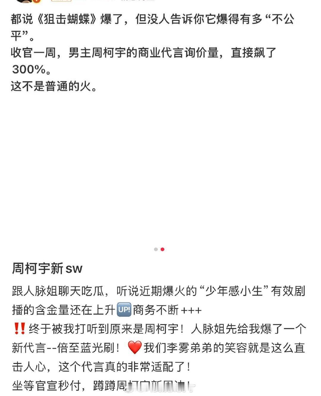 《狙击蝴蝶》让周柯宇的商业价值飙升300%,这部剧女主更出圈一些吧,陈妍希商业价