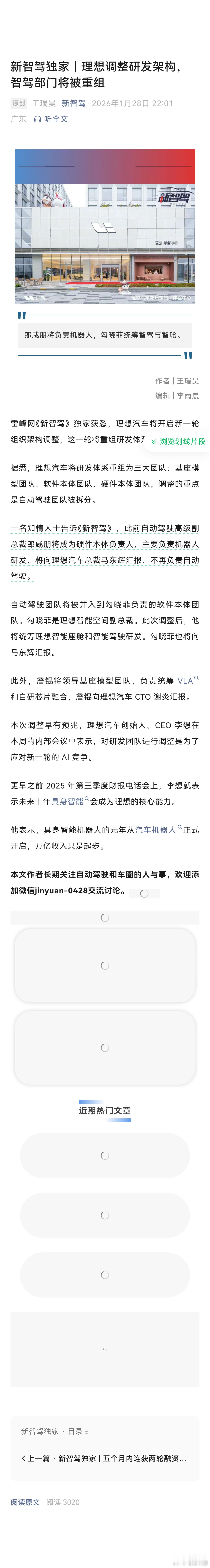 【理想人事大调整】 ❶自动驾驶高级副总裁郎咸朋将成为硬件本体负责人,主要负责机器人研发,将向理想汽车总裁马东辉汇报,不再负责自动驾驶。 ❷自动驾驶团队将被并入到勾晓菲负责的软件本体团队。勾晓菲是理想智能空间副总裁。此次调整后,他将统筹理想智能座舱和智能驾驶研发。勾晓菲也将向马东辉汇报。 ❸詹锟将领导基座模型团队,负责统筹 VLA 和自研芯片融合,詹锟向理想汽车 CTO 谢炎汇报。理想汽车