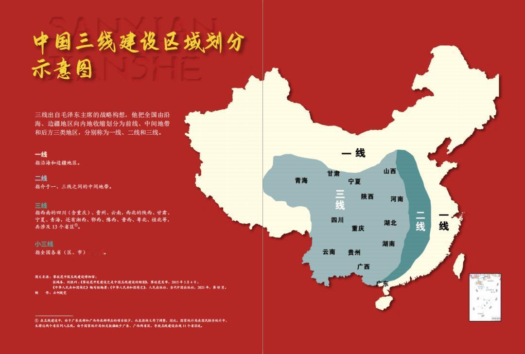 20世纪60年代中国三线建设 三线指中国按战略重要性划分三个地理圈层,包括沿海、沿边前线、中部缓冲带和核心中西部地区。