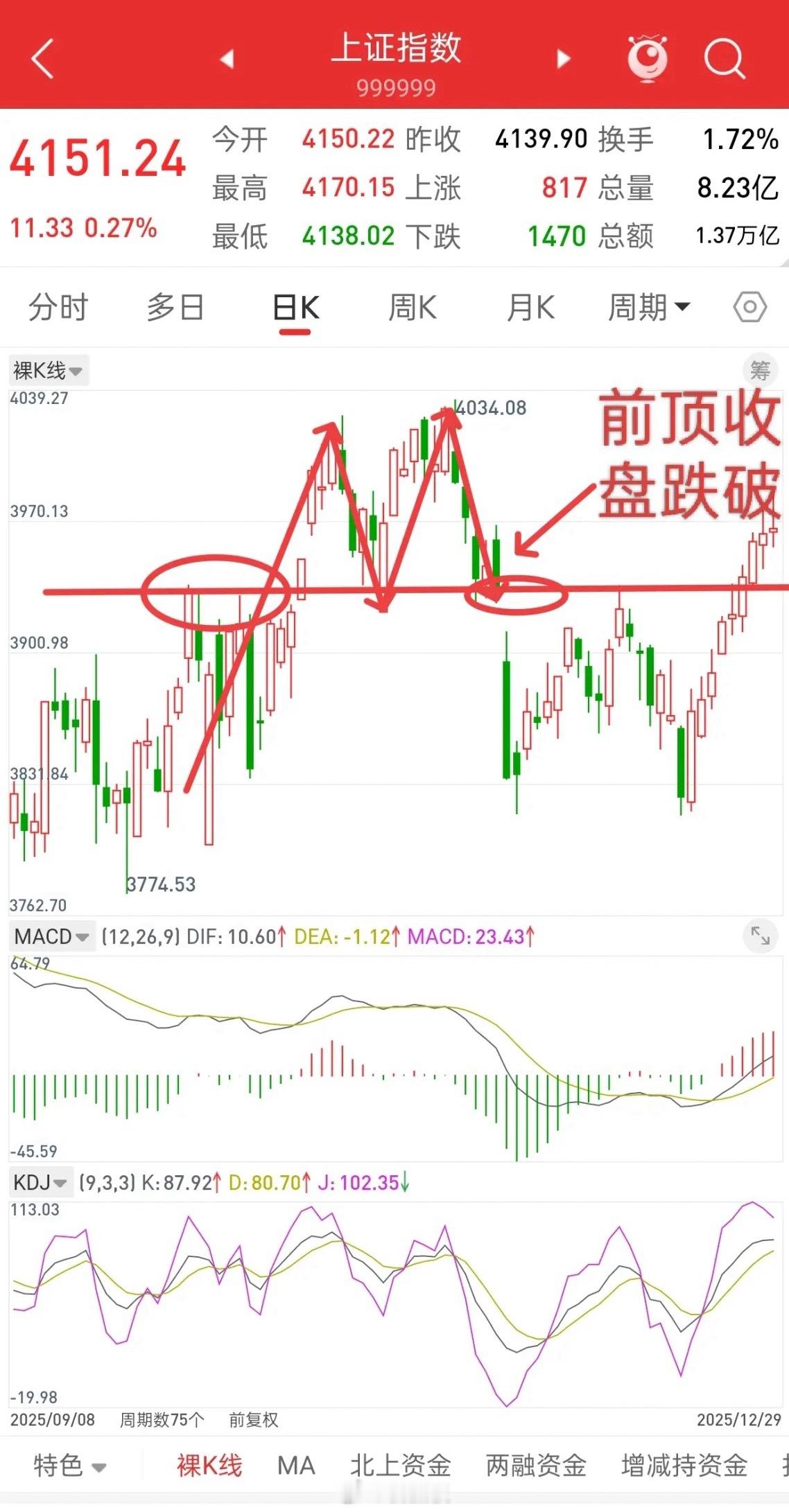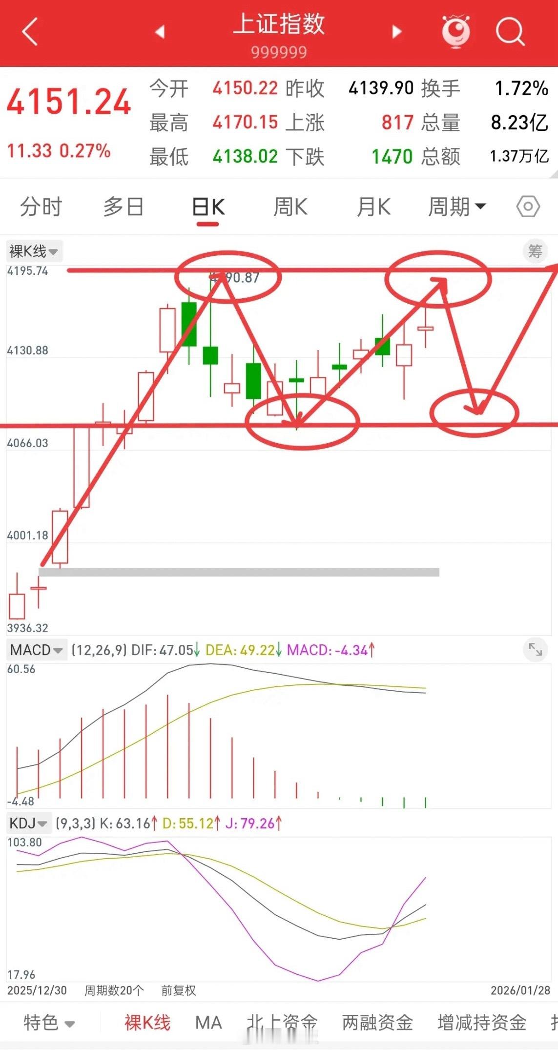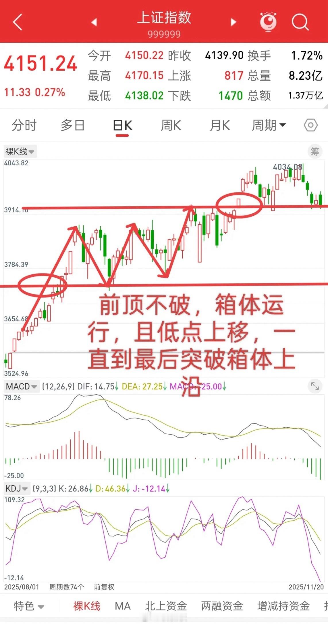 大盘,未来风险和机遇!截止到今天为止,大盘依然在4080-4190这个箱体运行,后市行情操作策略:越接近前高4190附近,风险大于机会,因为要谨防双顶。同时,越靠近4100附近,机会越大于风险。这个箱体早晚会走出来,如往上突破4190,后面回踩不破,那就上一个台阶。如跌破4080,后面反弹不过去,那就下一个台阶。情况就是这么个情况
