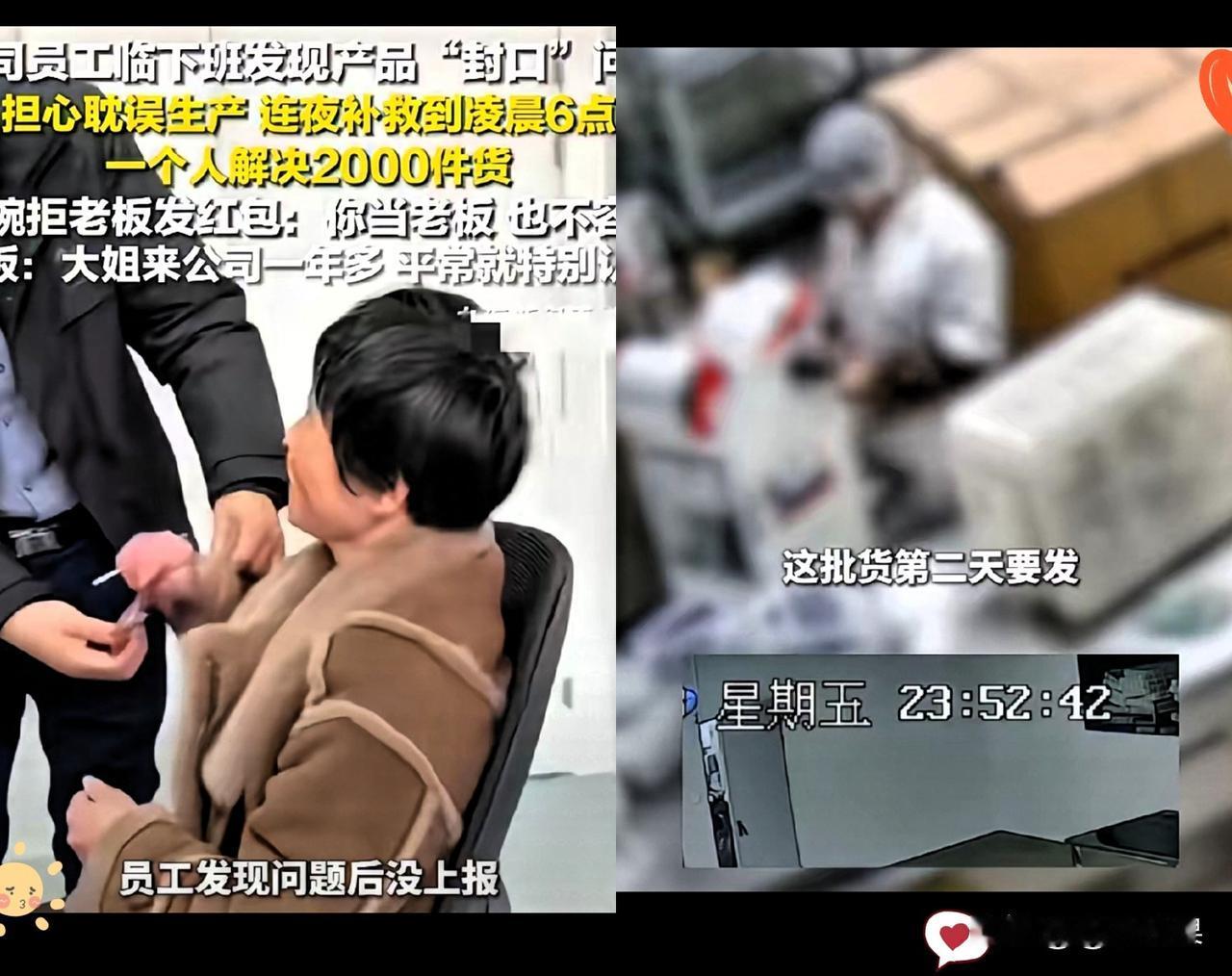 老实人终于被看见了!山东一公司大姐临下班,发现次日要发的2000件货物封口有问题,她没上报没声张,自己默默留下来熬了一整夜补救,忙到凌晨六点全部搞定,一点没耽误发货。 老板查监控看到大姐独自埋头苦干的身影,又感动又心疼,当场给大姐包了大红包,还特意批了几天假让她好好休息。职场中能力固然重要,但这份把公司当家护的责任心更难得,大姐宁可自己受累熬夜,也不愿让公司蒙受损失,这份担当太可贵。 员工真心付出,老板懂得感恩回馈,这才是最好的双向奔赴,这样的上下级相处模式,才是企业最该有的样子,温暖又有力量!