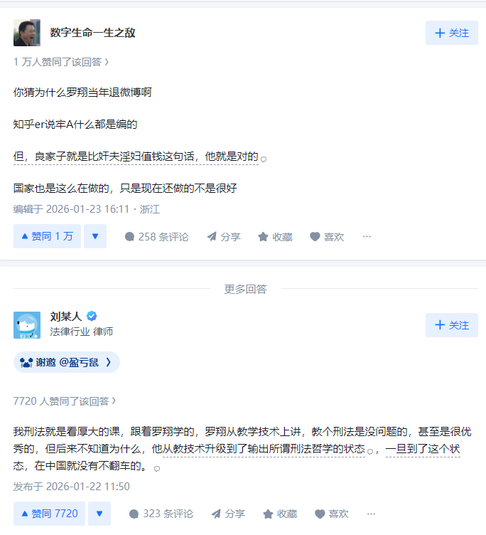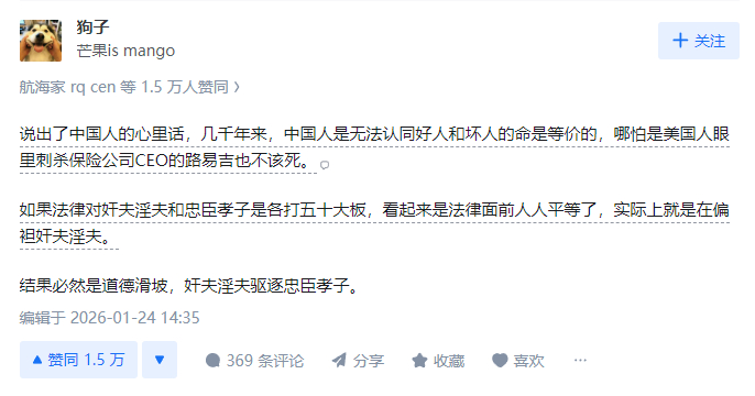 #牢A反驳罗翔#【#如何看待牢A不认同罗翔的叙事逻辑#】“美国斩杀线”概念提出者近日在直播中提到,我们要跳出西方式的逻辑思维框架。他拿《水浒》举例,武松杀死潘金莲与西门庆,如果按照“武松的命是命,潘金莲与西门庆的命也是命”的逻辑,那么应当判武松死刑,以命换命。但是牢A提出疑问:忠臣孝子的命,和奸夫淫妇的命,是一样的吗?牢A称,哪怕在封建社会,《水浒》中判了武松流放而不是死刑,也是认为忠臣孝子的命比奸夫淫妇的命更宝贵。如果最后形成“缉毒警的命是命,毒贩的命也是命”类似的平等,造成的结果一定是道德滑坡。你怎么看待牢A的观点呢?