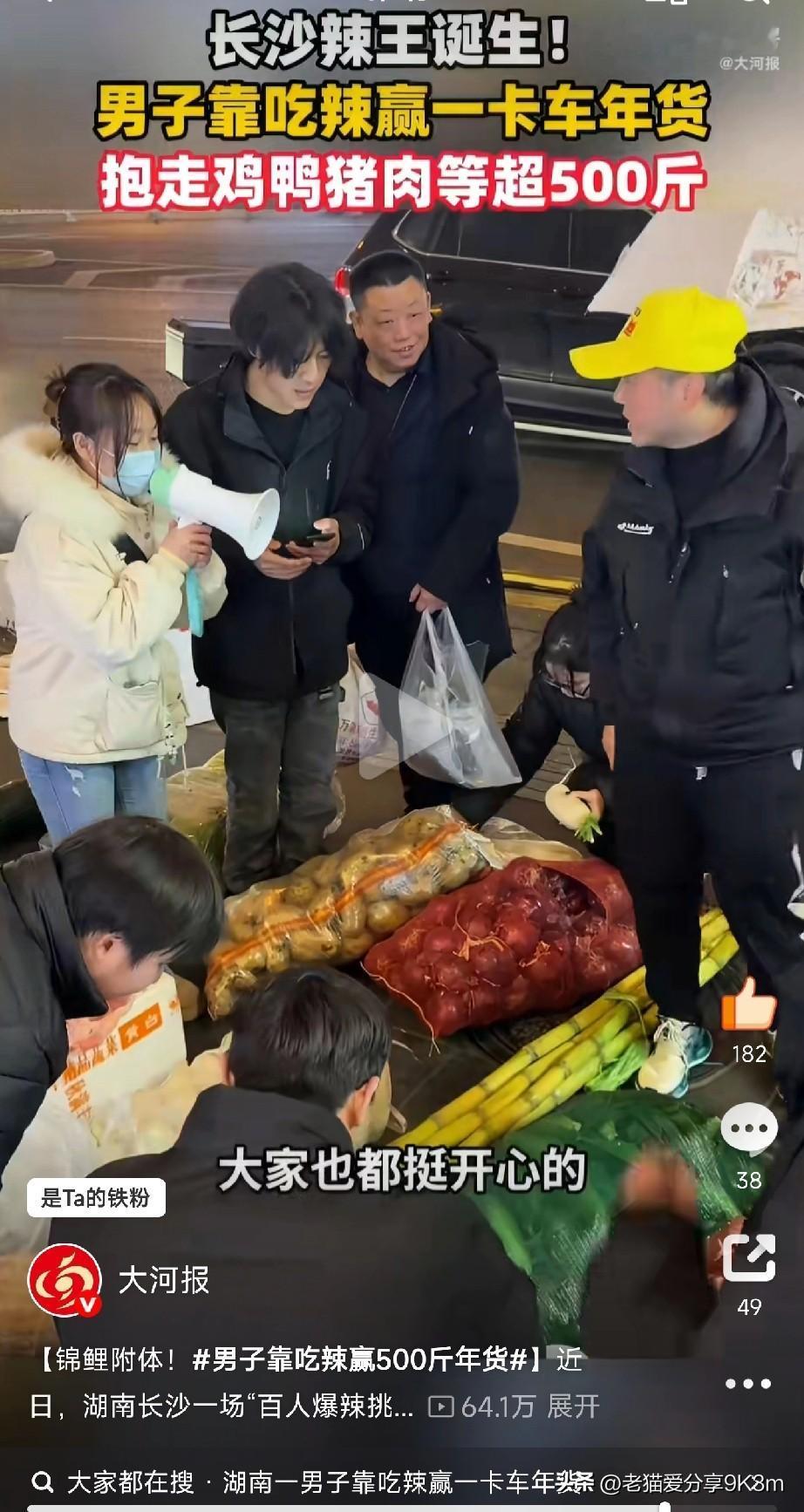 吃辣也能成为赢家 如果告诉你,靠吃辣能赢回一整卡车年货,你敢挑战吗? 长沙一位魏先生就做到了——他在百人爆辣挑战赛中夺冠,直接拉走500斤年货! 冠军奖品单看懵网友: ✅ 200斤土猪肉 ✅ 5只鸡、5只鸭 ✅ 100斤瓜果蔬菜 ✅ 100斤大米 魏先生自己都意外:“本来是试试,这下过年不用备年货了!” 网友一边流口水一边操心: “这是辣出来的年终奖啊!” “实力演绎‘靠嘴吃饭’!” 虽然奖品诱人,但医生提醒: 过度刺激性饮食可能引发急性胃肠炎, 不要盲目参与高强度吃辣挑战, 平时适度吃辣有益,切忌突然“爆辣” 。 **有趣的是,这场活动折射出“湘辣精神”—— 湖南人爱吃辣、能吃苦、敢拼敢赢的性格,连年货都要“辣”着挣回来! 这也提供了过年新思路:与其囤货,不如试试用特长赢年货? (文章素材来自大河报,侵删)